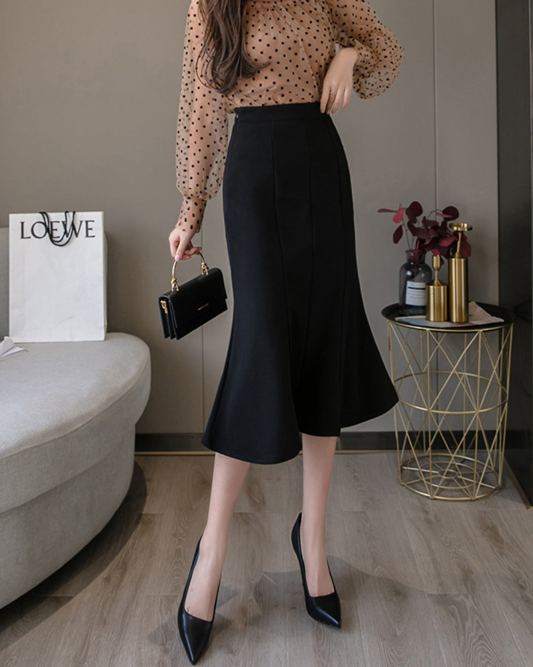 歩くたびに揺れるフィッシュテールの裾が女性らしさを演出。腰まわりはすっきり、裾はほどよく広がり、美しいフレアシルエットに。センター切り替えラインが縦の印象を強調し、スタイルアップ効果も。