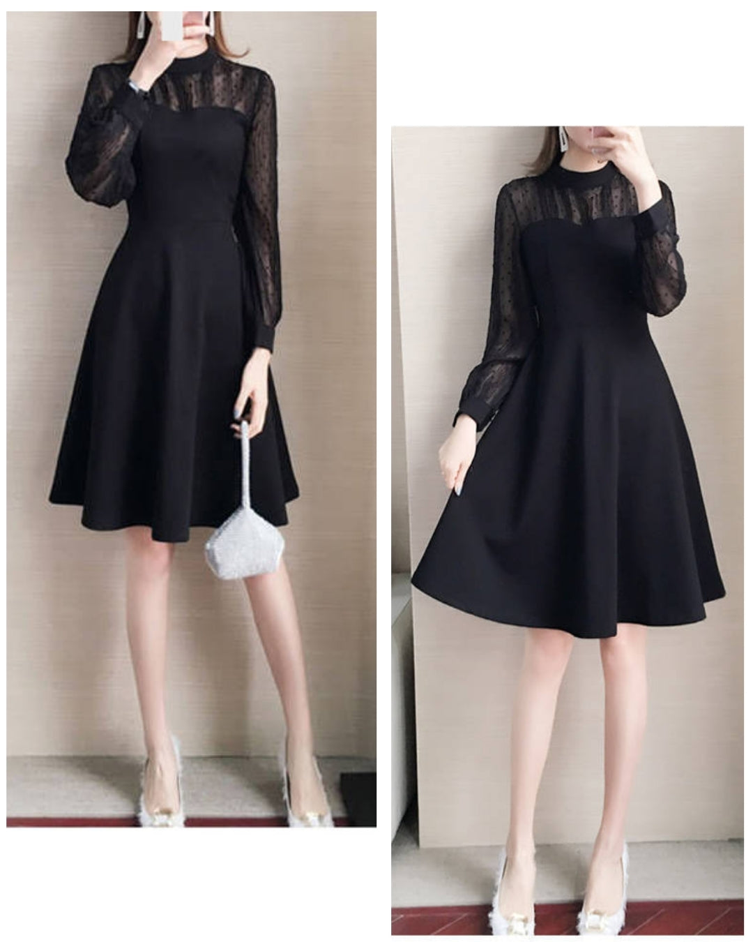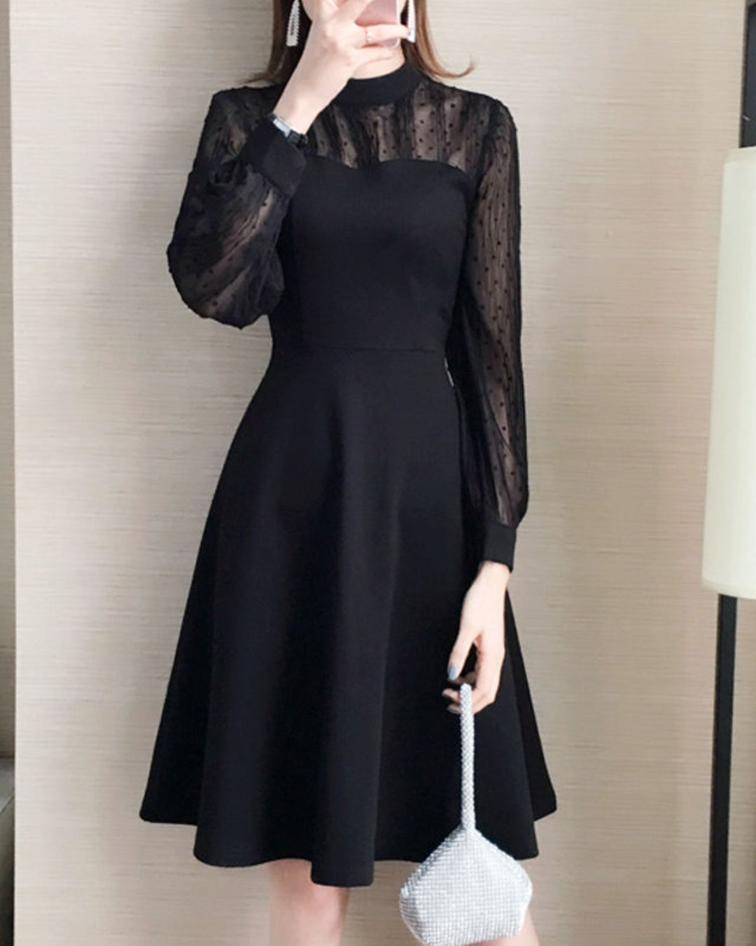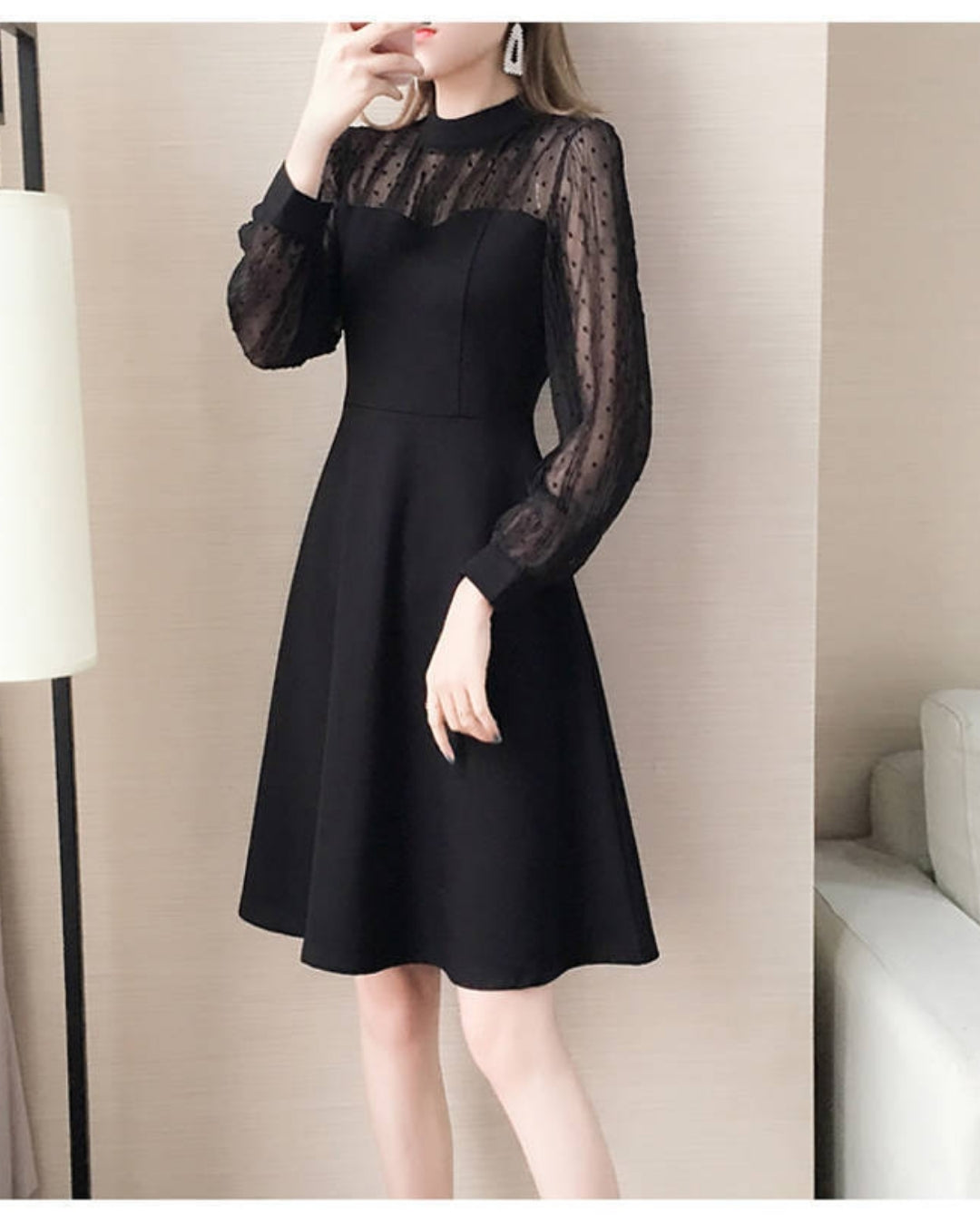 細かなドットチュールがほんのり肌を透かし、上品な色気をさりげなく演出。露出を抑えながらも華やぐ絶妙なバランスで、1枚着るだけで大人女性の品格がぐんと引き立つデザインです。どんな世代にも映える万能ブラック。
