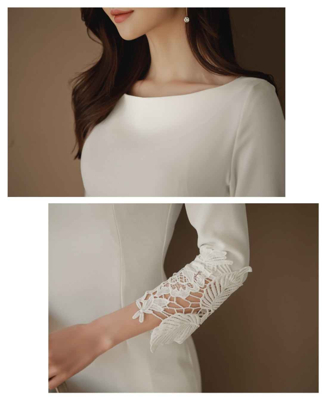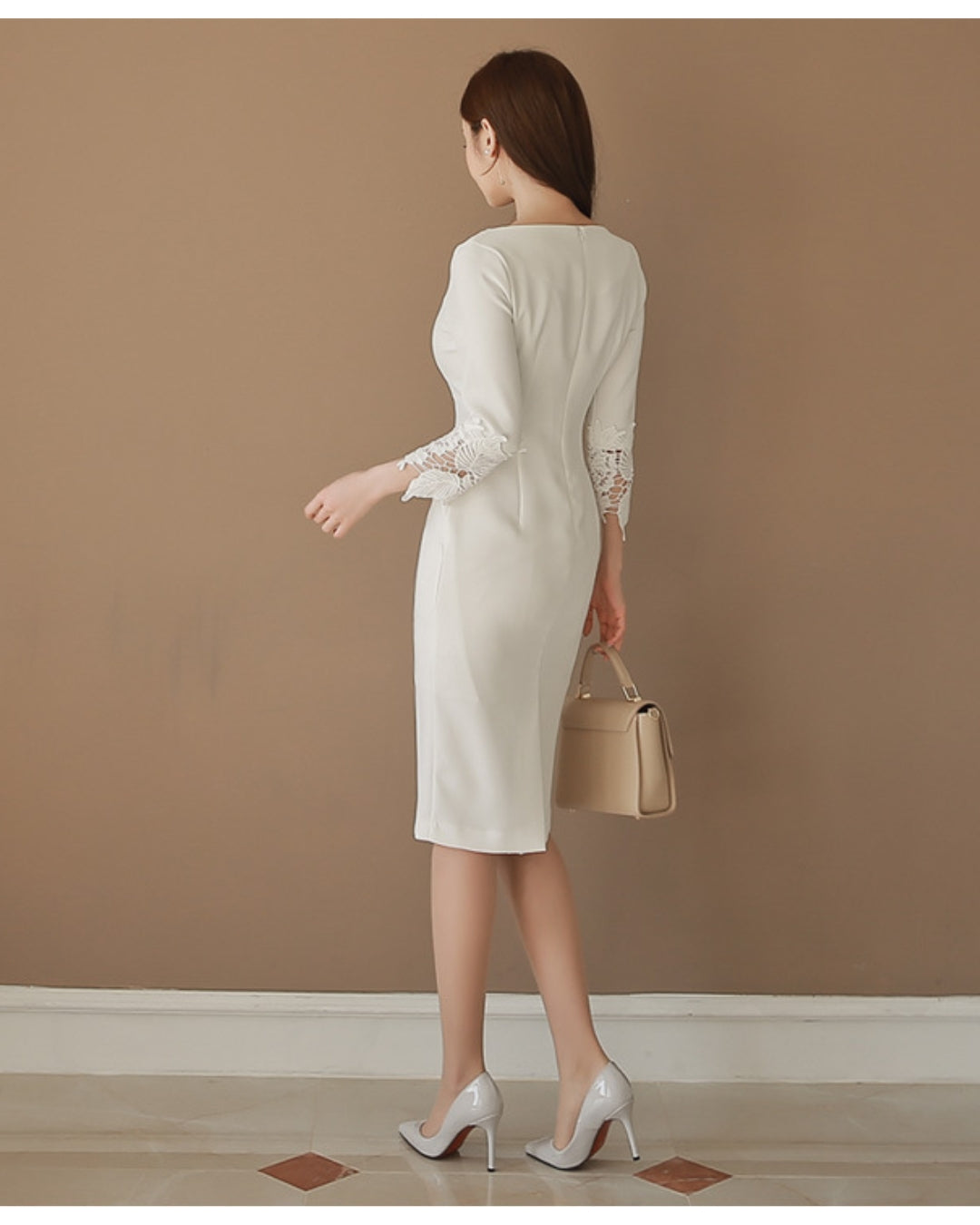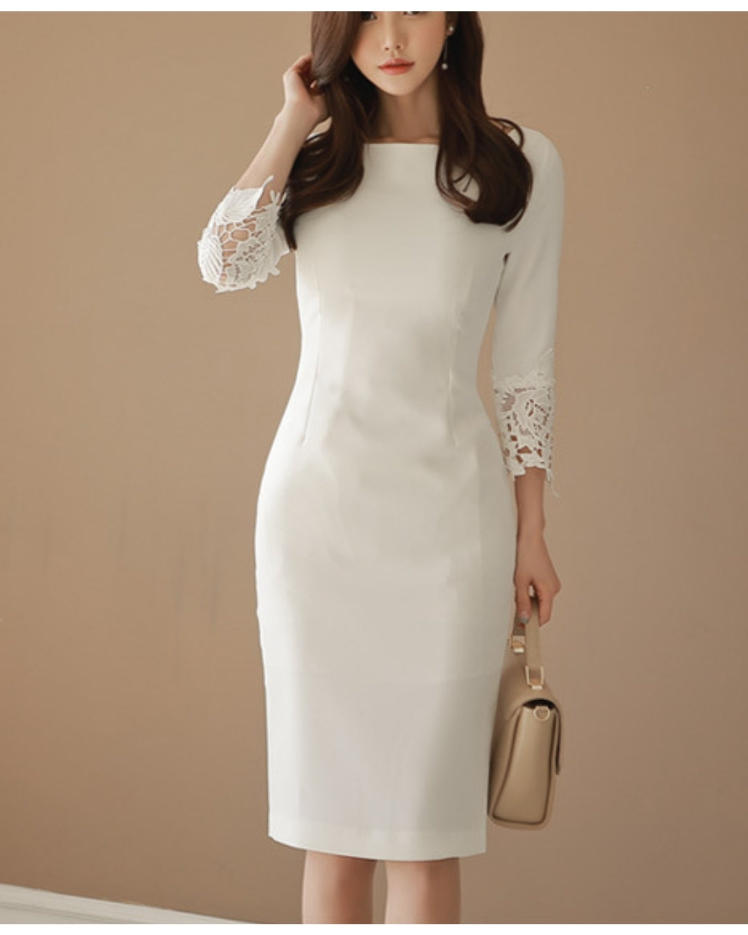 シンプルなIラインに繊細なレース袖を重ね、通勤から食事会、ホテルランチまで自然に馴染む大人のきれいめワンピースです。