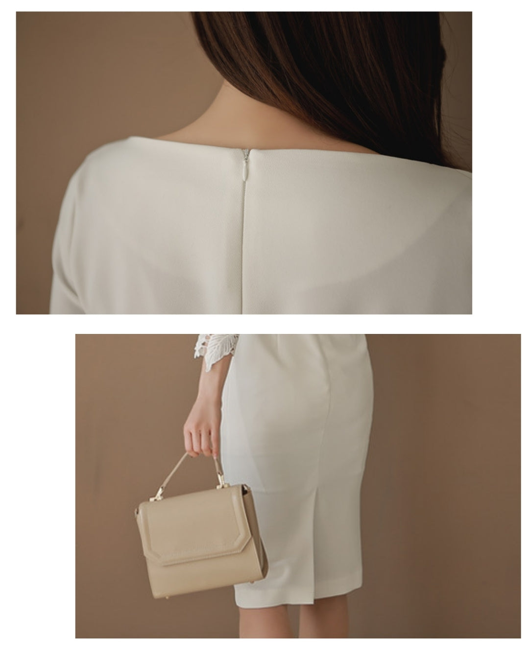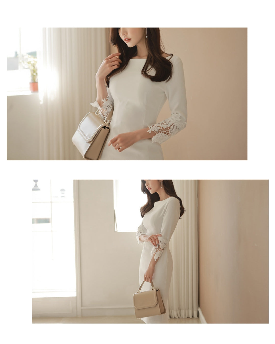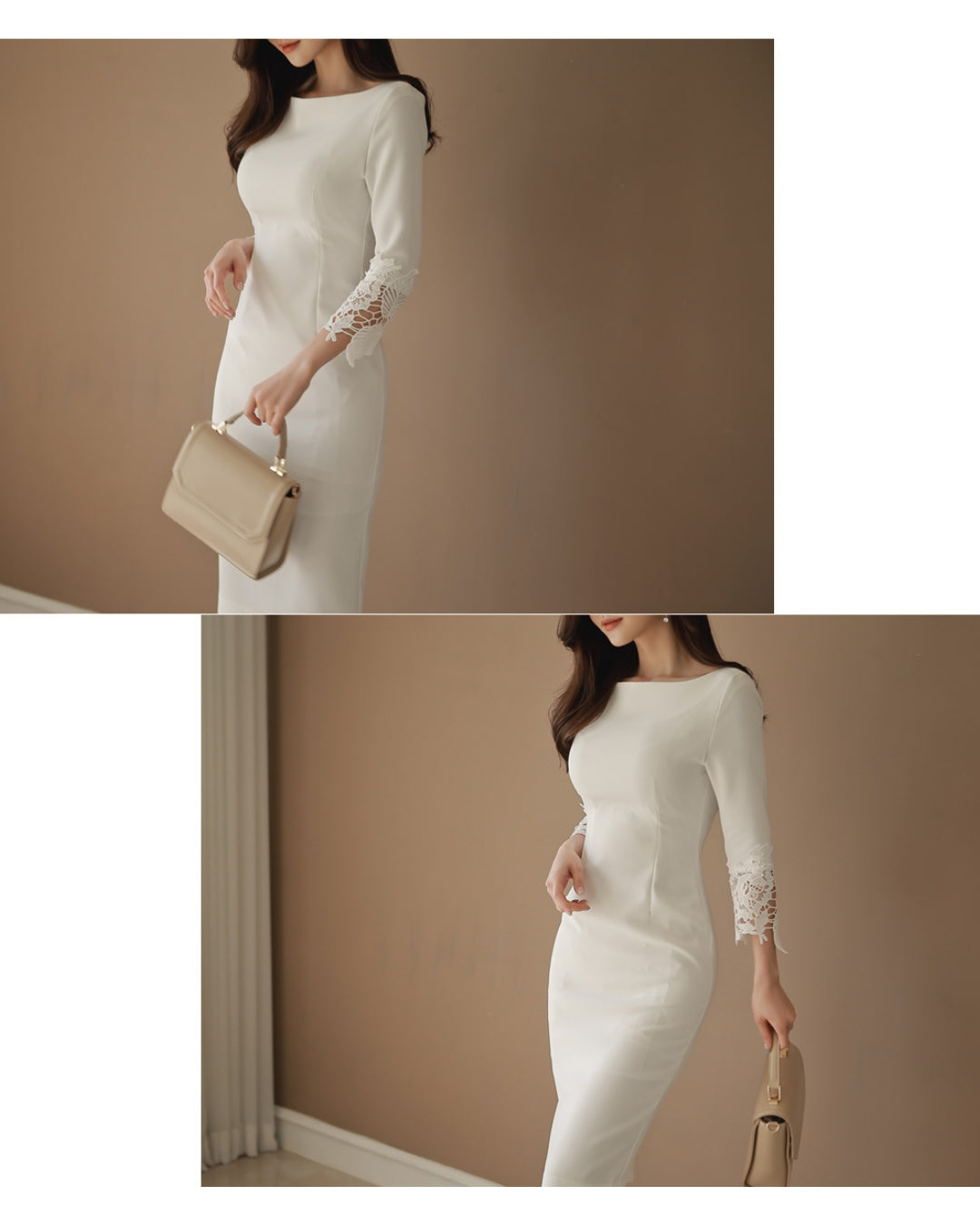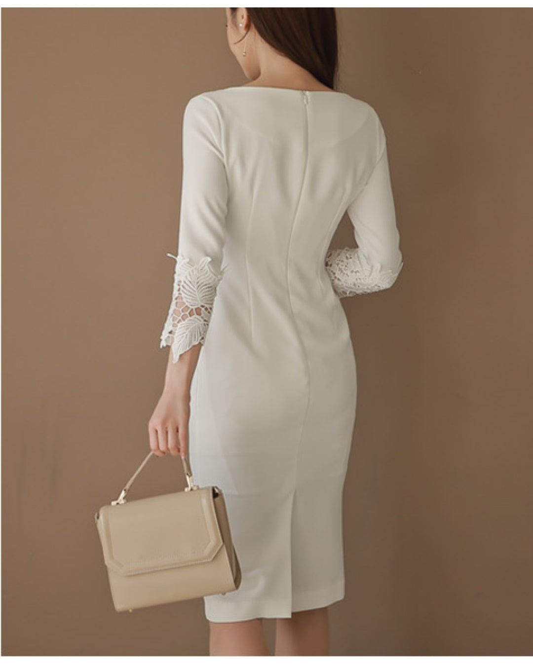 シンプルなIラインに繊細なレース袖を重ね、通勤から食事会、ホテルランチまで自然に馴染む大人のきれいめワンピースです。