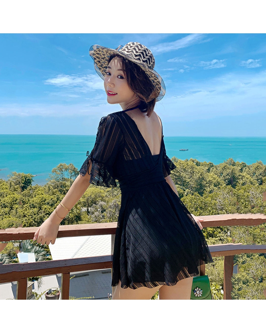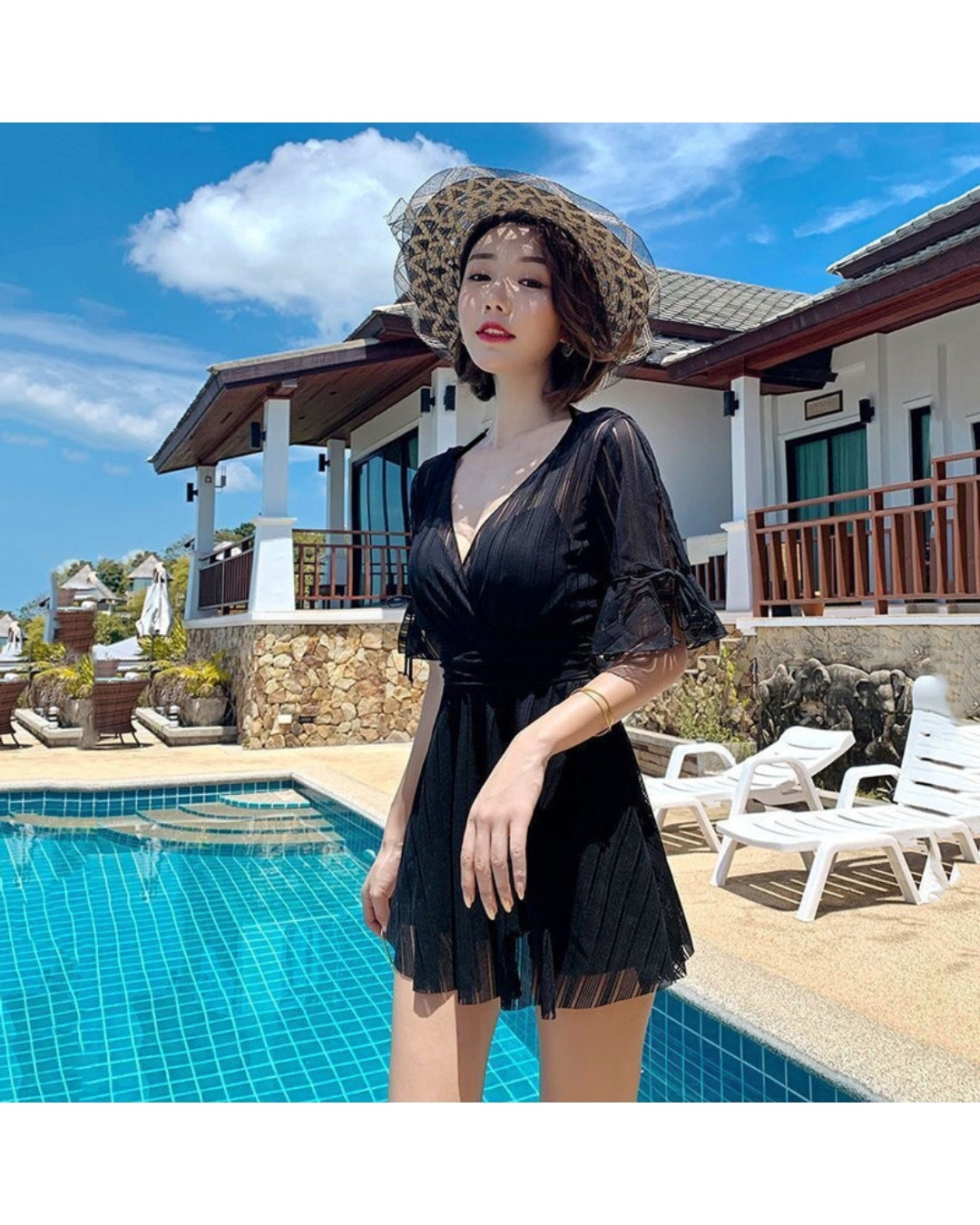 Vネック×レース×フレア袖で華奢見え&体型カバー✨露出控えめでもおしゃれ感たっぷり🌺リゾートもプールもこれ1枚で決まり♪