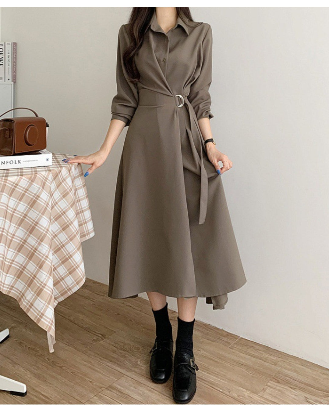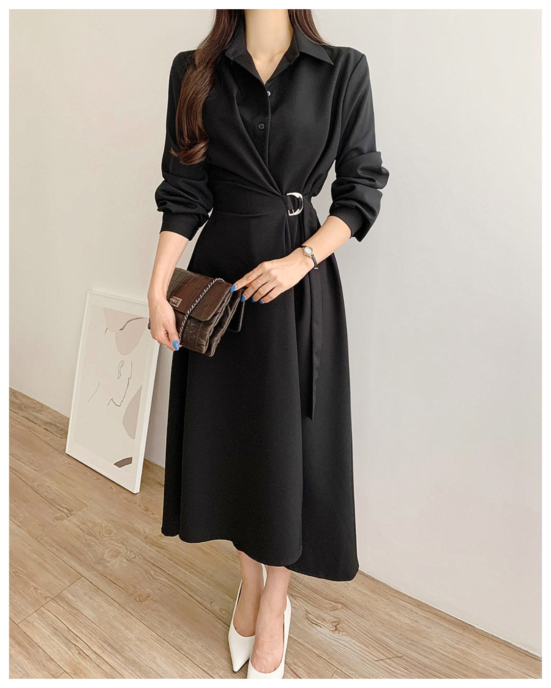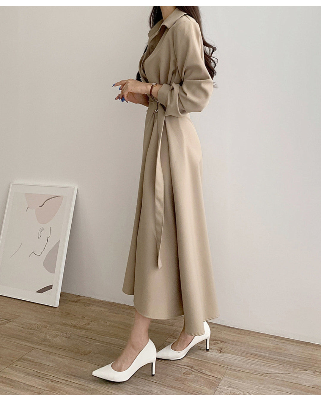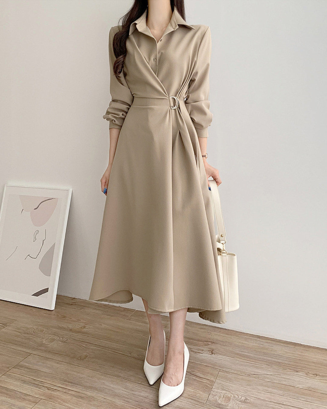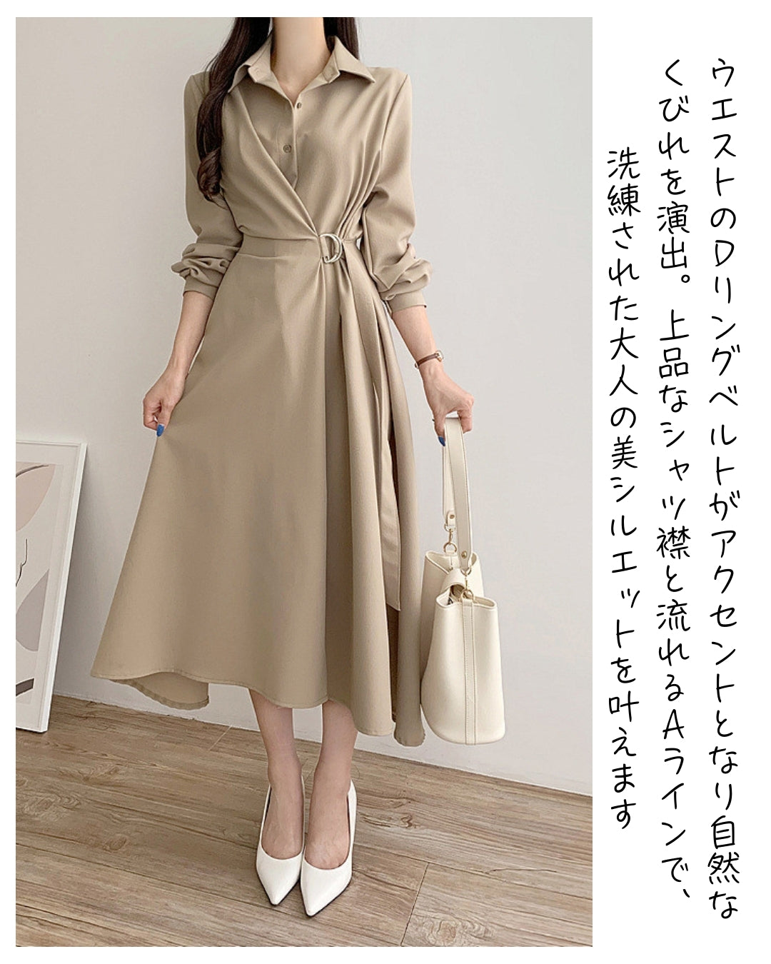 襟付きデザインとウエストベルトで美シルエットを叶えるミディ丈ワンピース