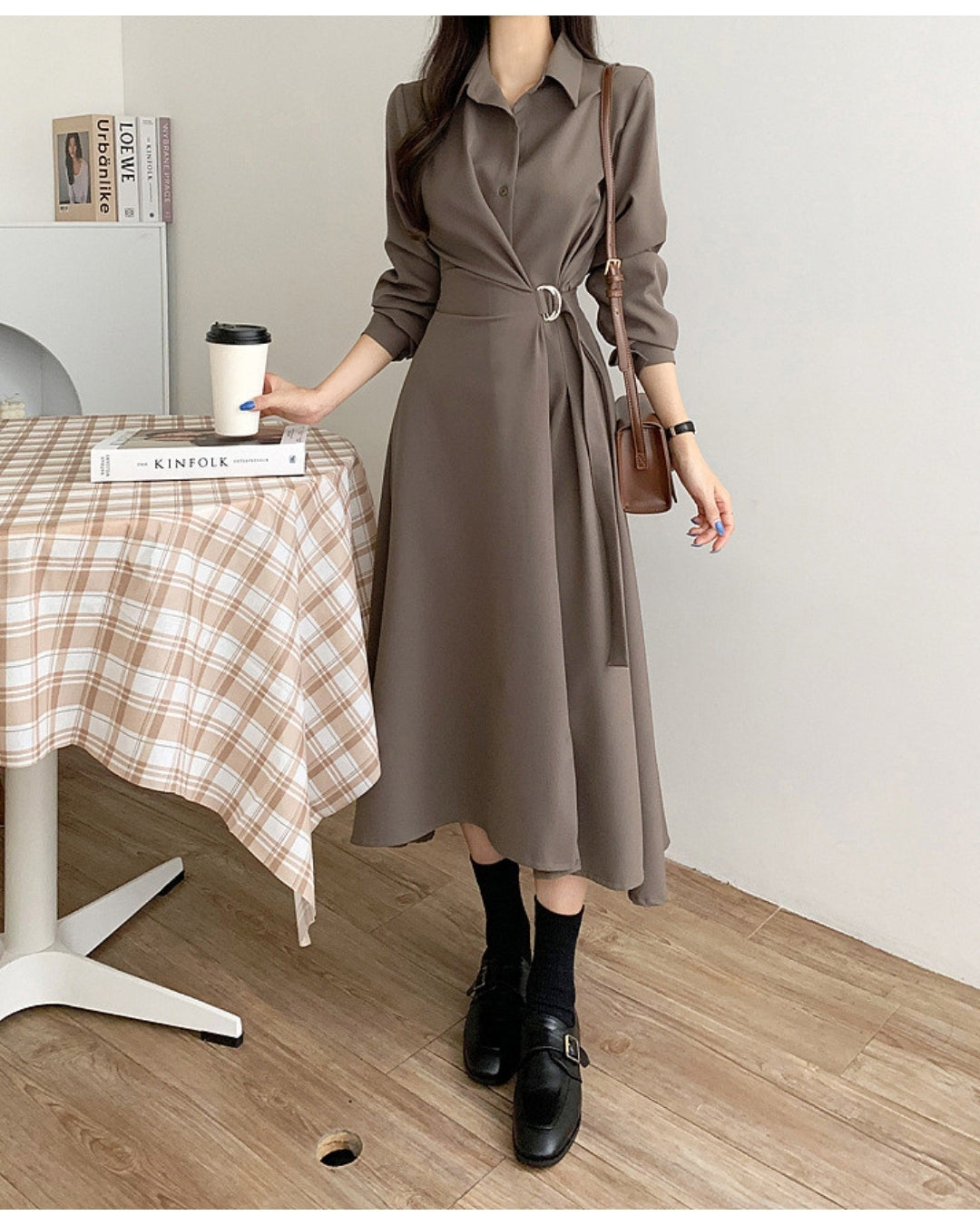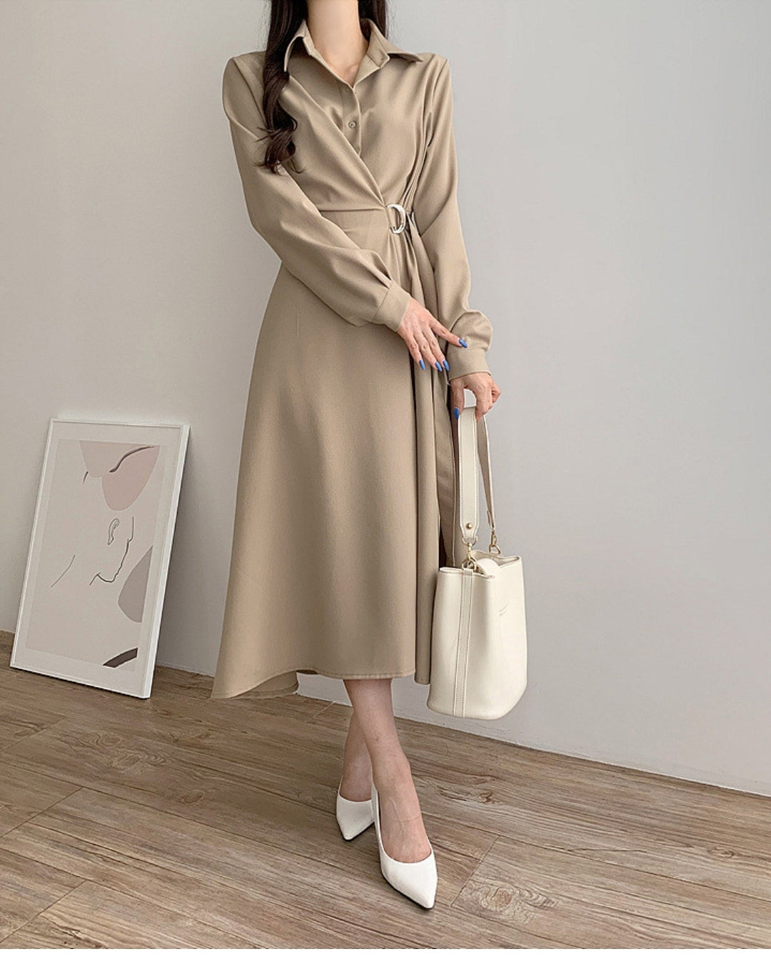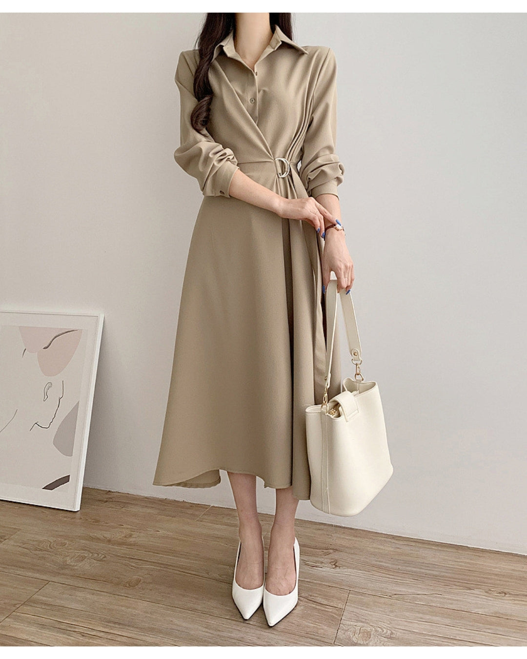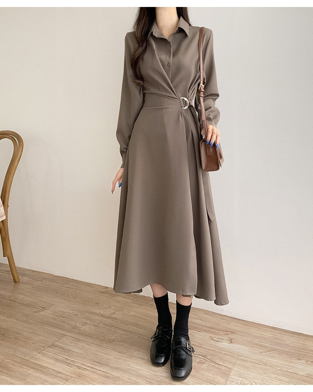 襟付きデザインとウエストベルトで美シルエットを叶えるミディ丈ワンピース