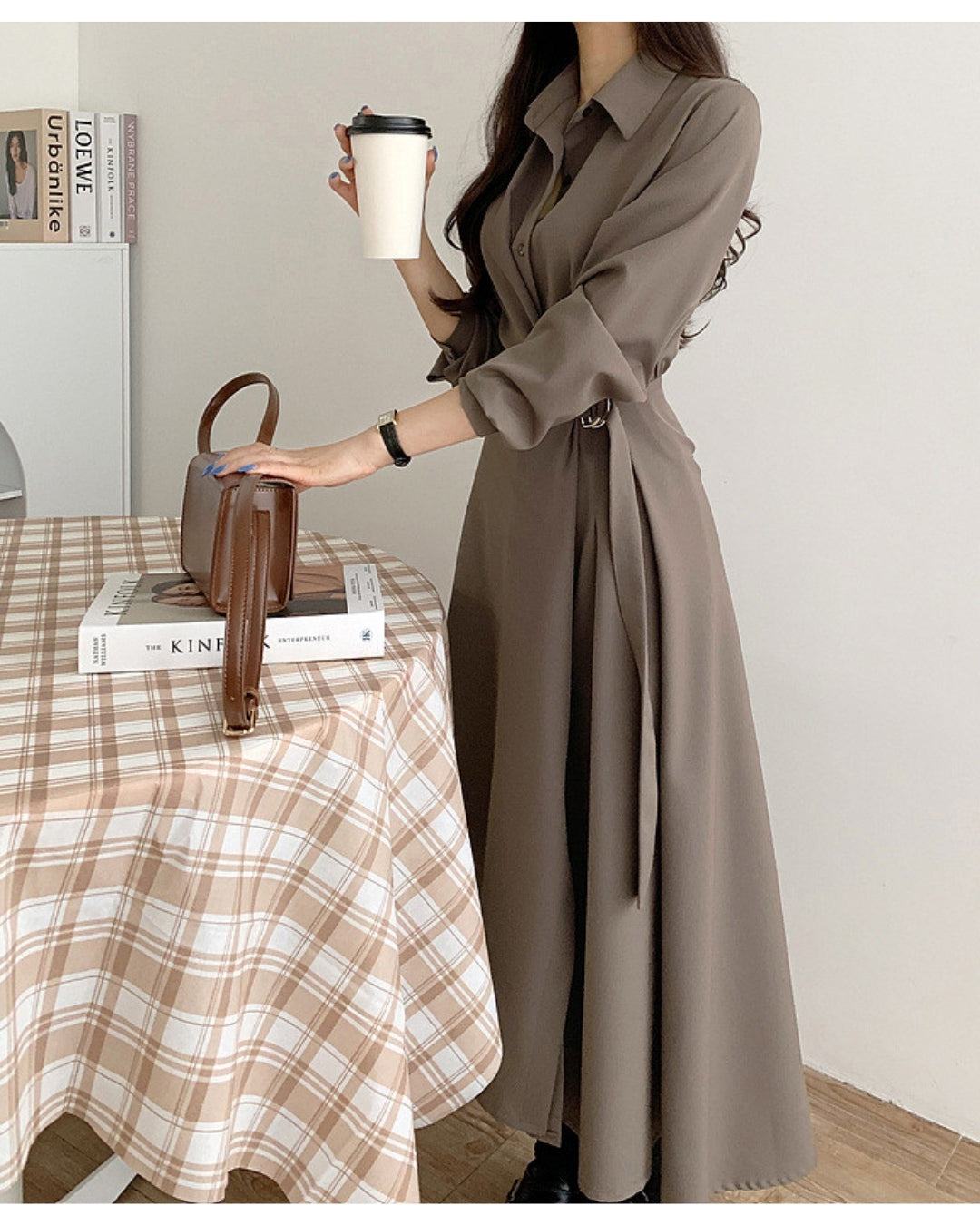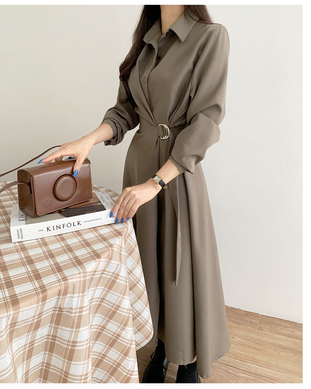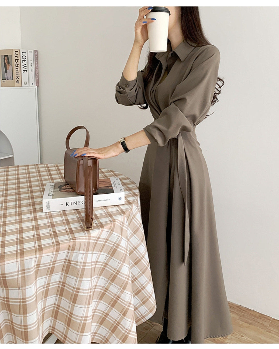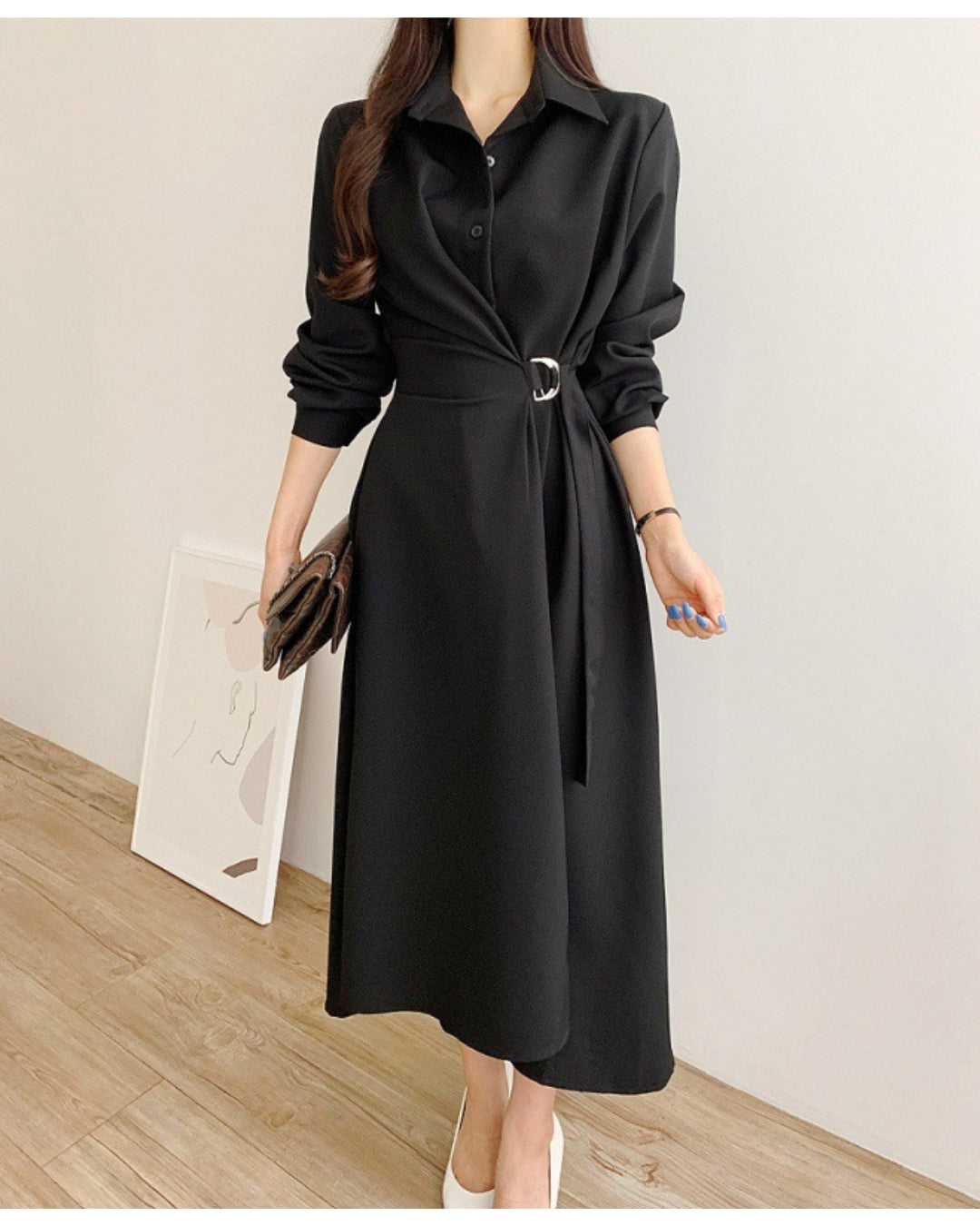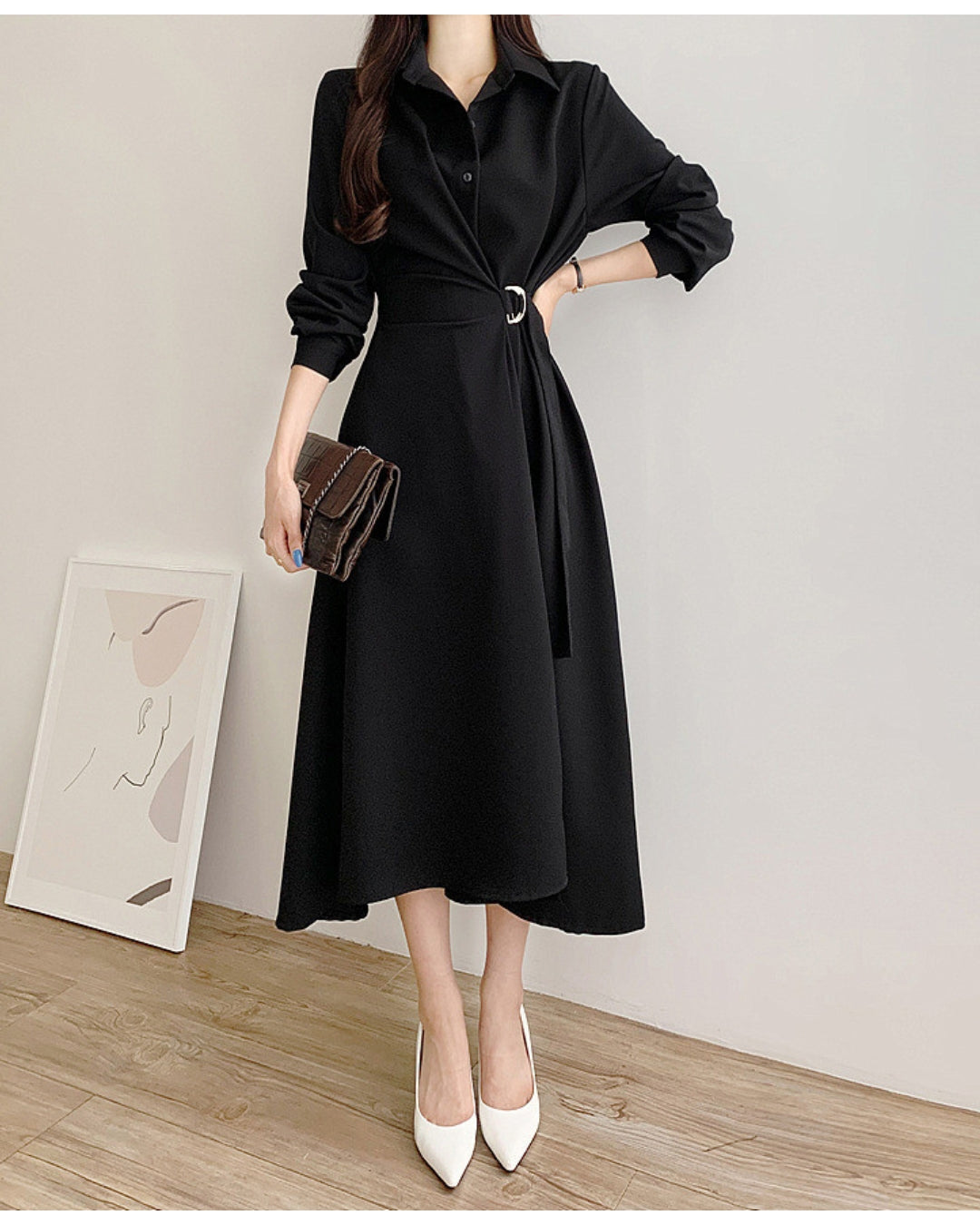 襟付きデザインとウエストベルトで美シルエットを叶えるミディ丈ワンピース