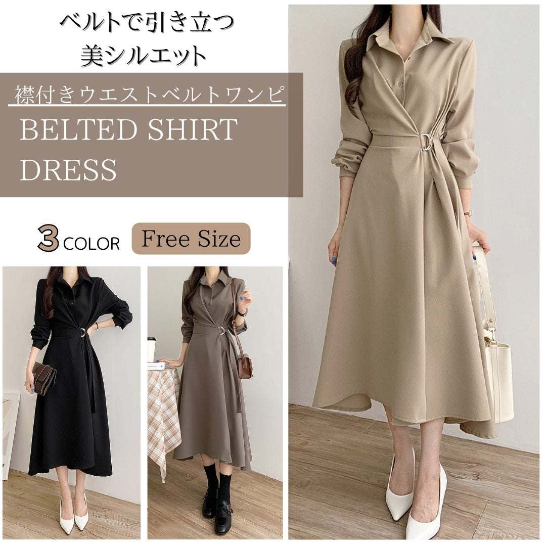 襟付きウエストベルトワンピース【ベルトで引き立つ美シルエット】