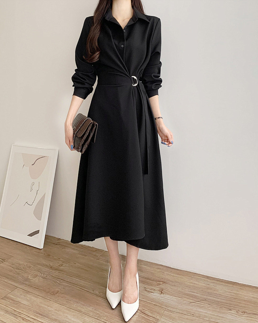 襟付きデザインとウエストベルトで美シルエットを叶えるミディ丈ワンピース