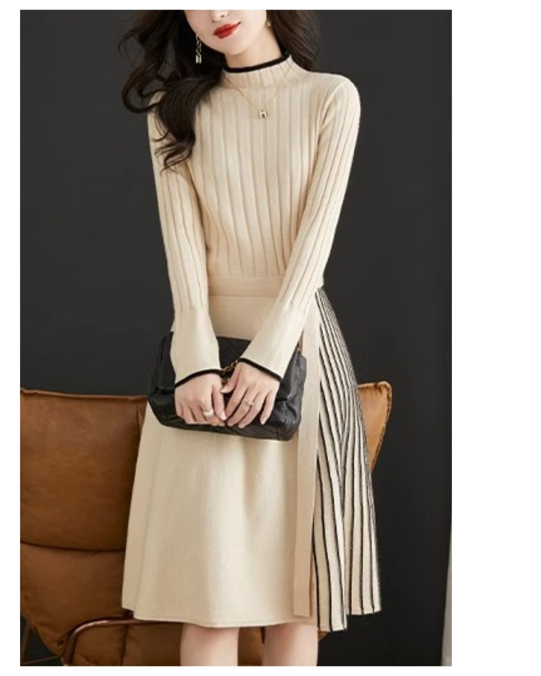 上身頃はリブ編みで縦ラインを強調し、裾はプリーツで動きをプラス。シンプルながら華やかさを感じさせる絶妙なデザインで、上品な大人スタイルを演出します。