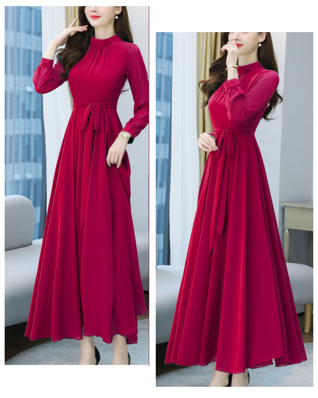 上品なハイネックとウエストリボンで女性らしさを引き立てる一枚。結婚式やパーティー、特別なお出かけにもぴったりな華やかデザインです💐