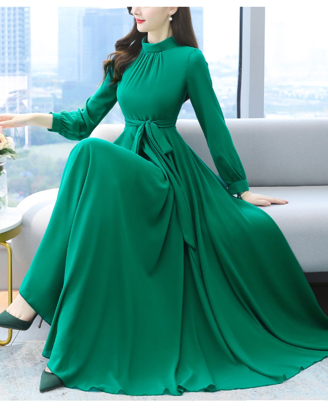 柔らかな生地が自然なドレープを生み出し、動くたびにしなやかに揺れるシルエット。身体のラインを美しく包み込み、品格ある佇まいを演出します。フォーマルな場面にも映える一枚です。
