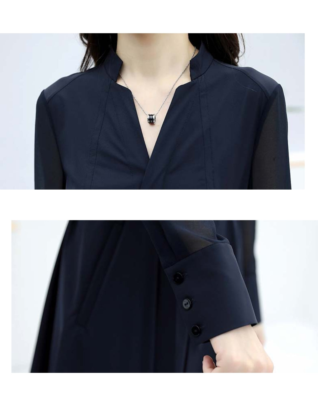 ほんのり透けるスリーブが腕を細く見せ、ネイビーの深みが全体を引き締める計算されたデザイン。重たさが出にくいので、春から秋までロングシーズン快適。フェミニンなのに大人っぽく決まります。