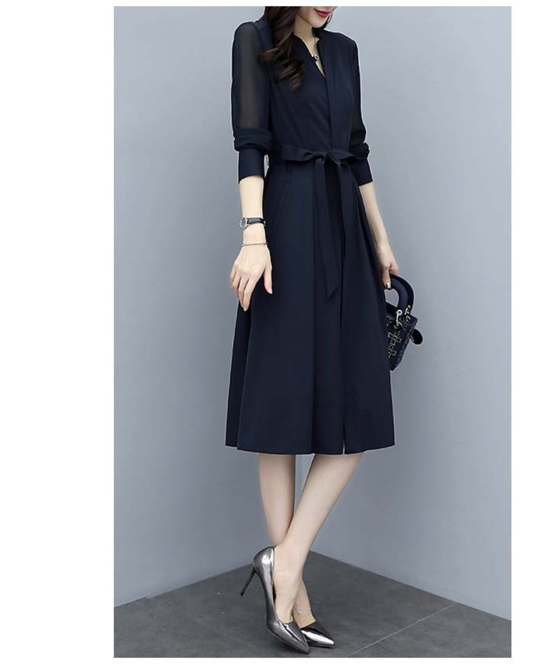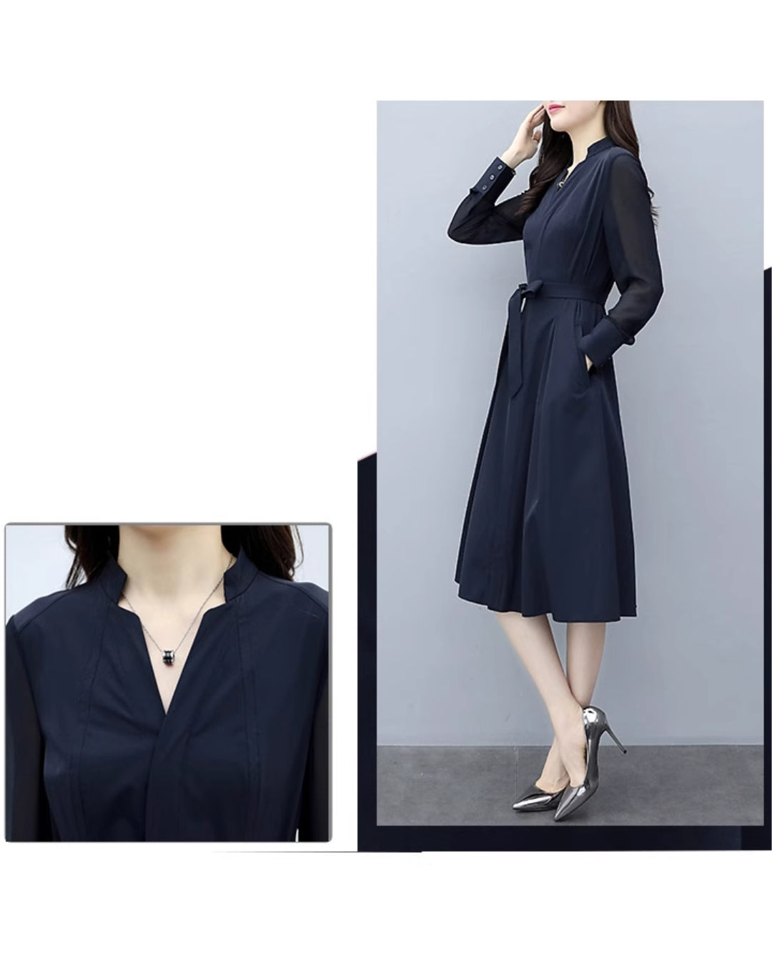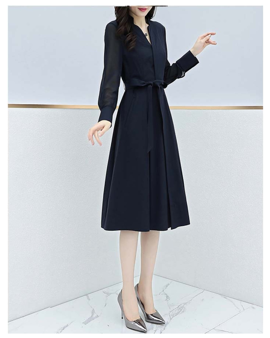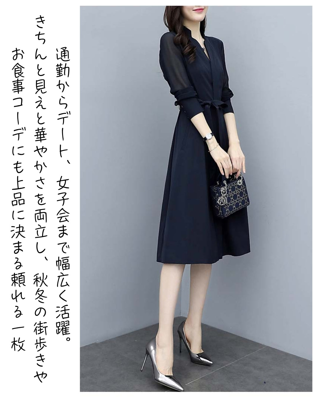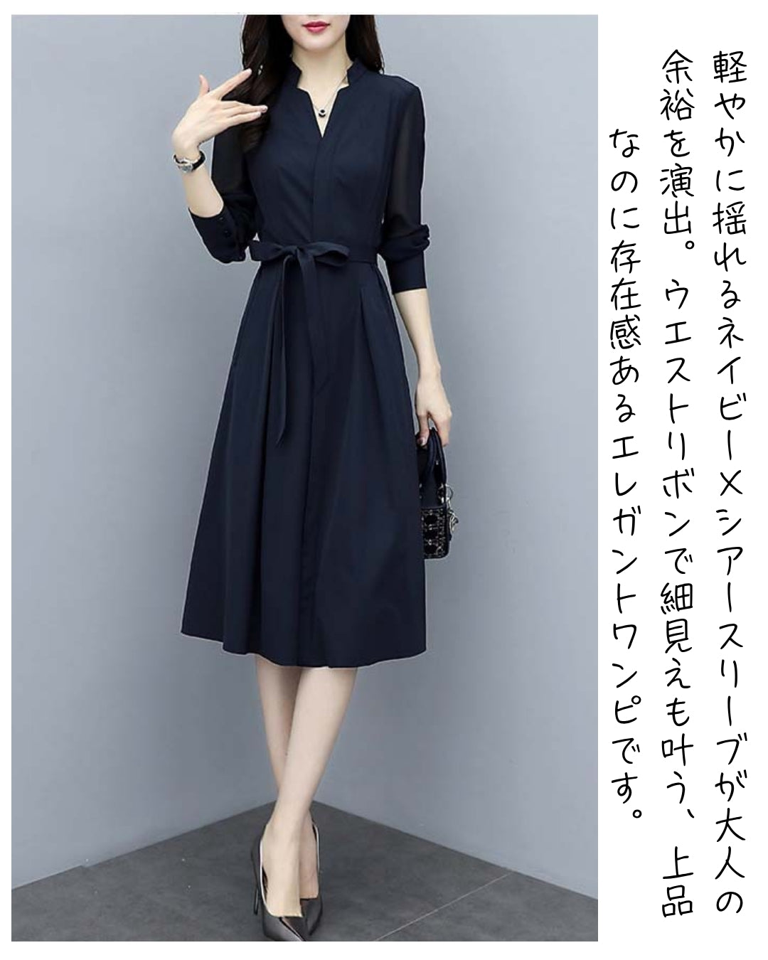 「このワンピ、本当に細見えがすごいんです…!✨ シアースリーブのおかげで腕がほっそり見えるし、ウエストもキュッと綺麗にくびれるので、“着ただけで美人度が上がる”って実感できます。ネイビーの上品さも相まって、出会う人みんなから褒められそう♡ 迷っている方、これは絶対“当たり”の一枚です!」
