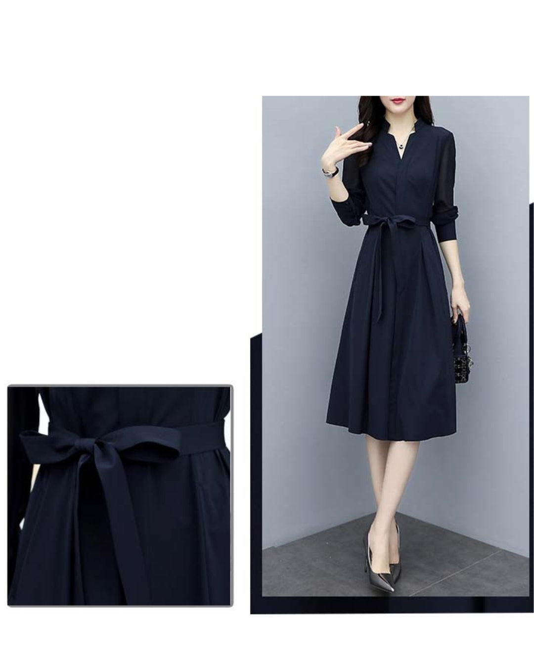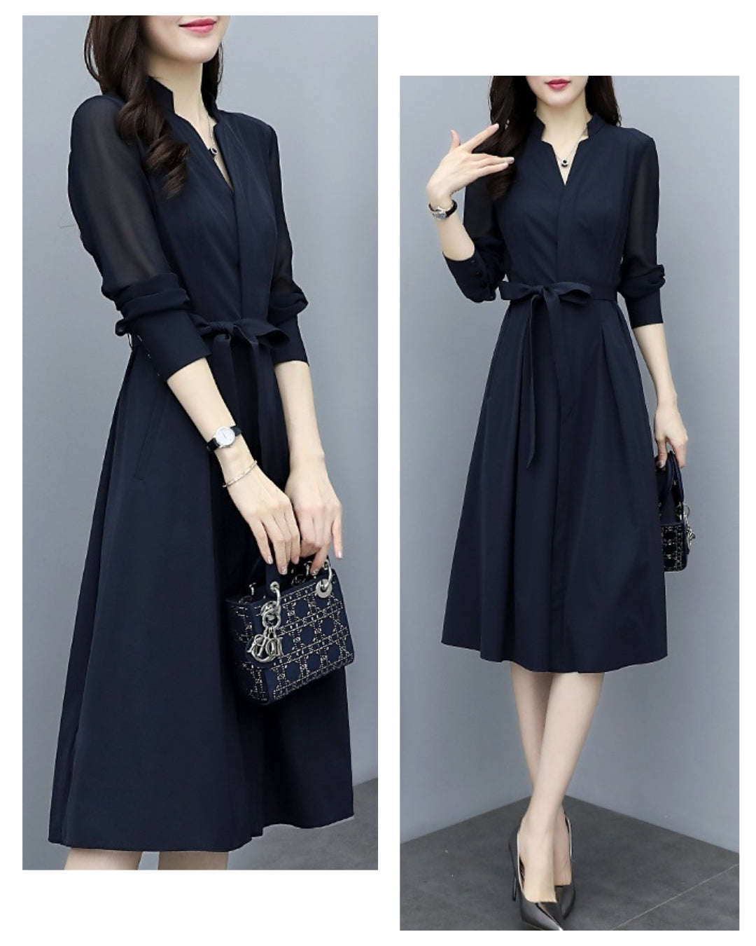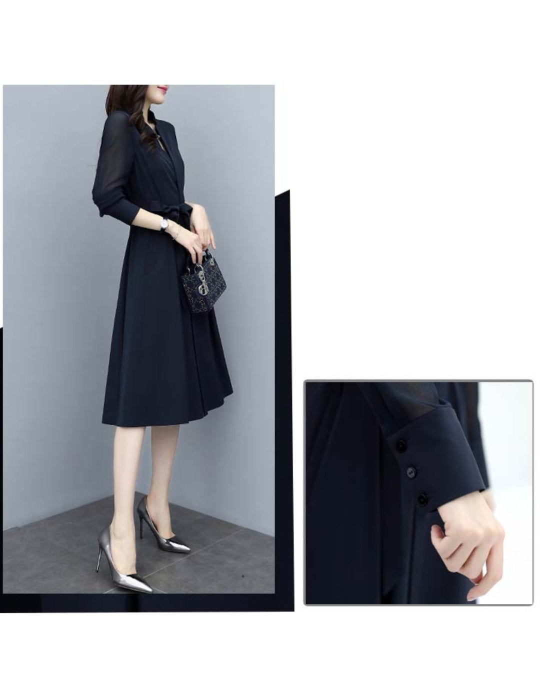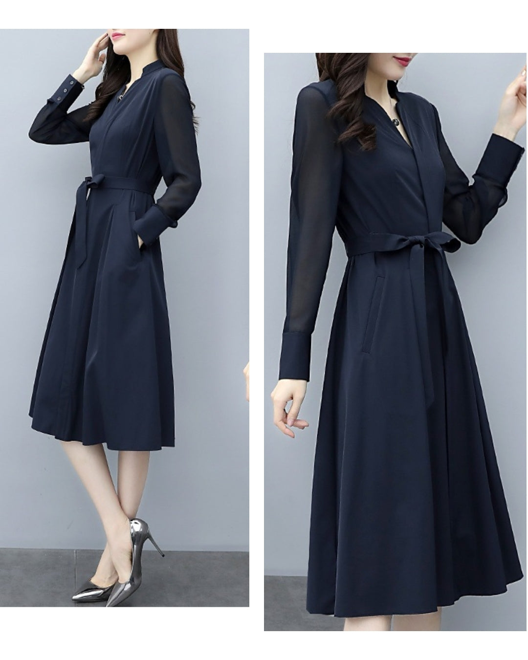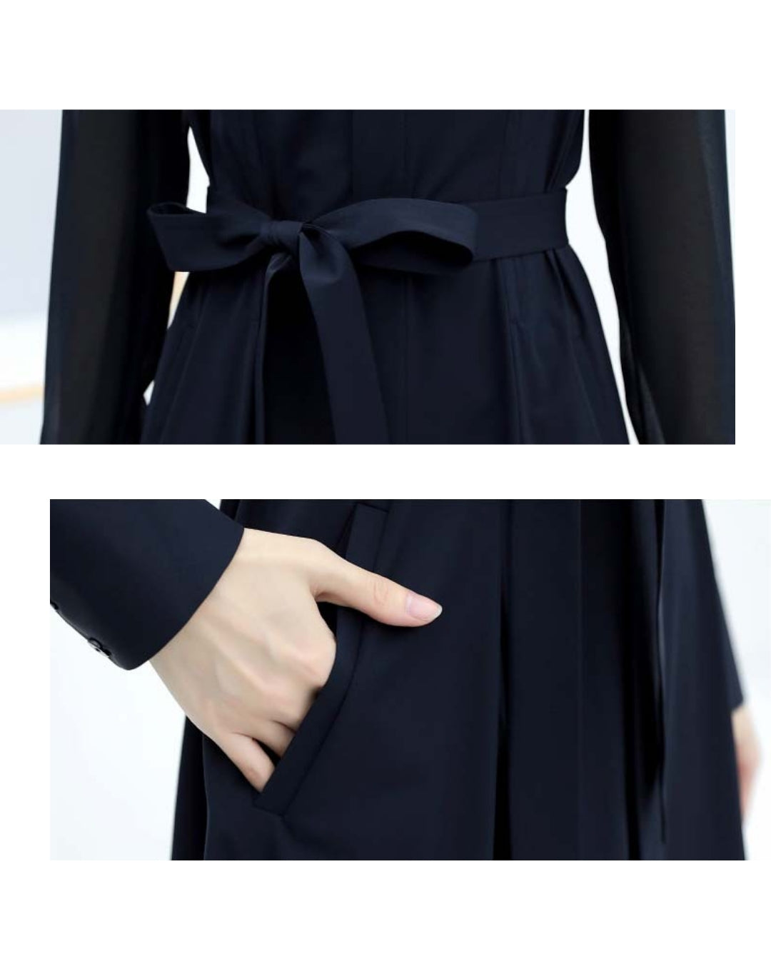 「このワンピ、本当に細見えがすごいんです…!✨ シアースリーブのおかげで腕がほっそり見えるし、ウエストもキュッと綺麗にくびれるので、“着ただけで美人度が上がる”って実感できます。ネイビーの上品さも相まって、出会う人みんなから褒められそう♡ 迷っている方、これは絶対“当たり”の一枚です!」