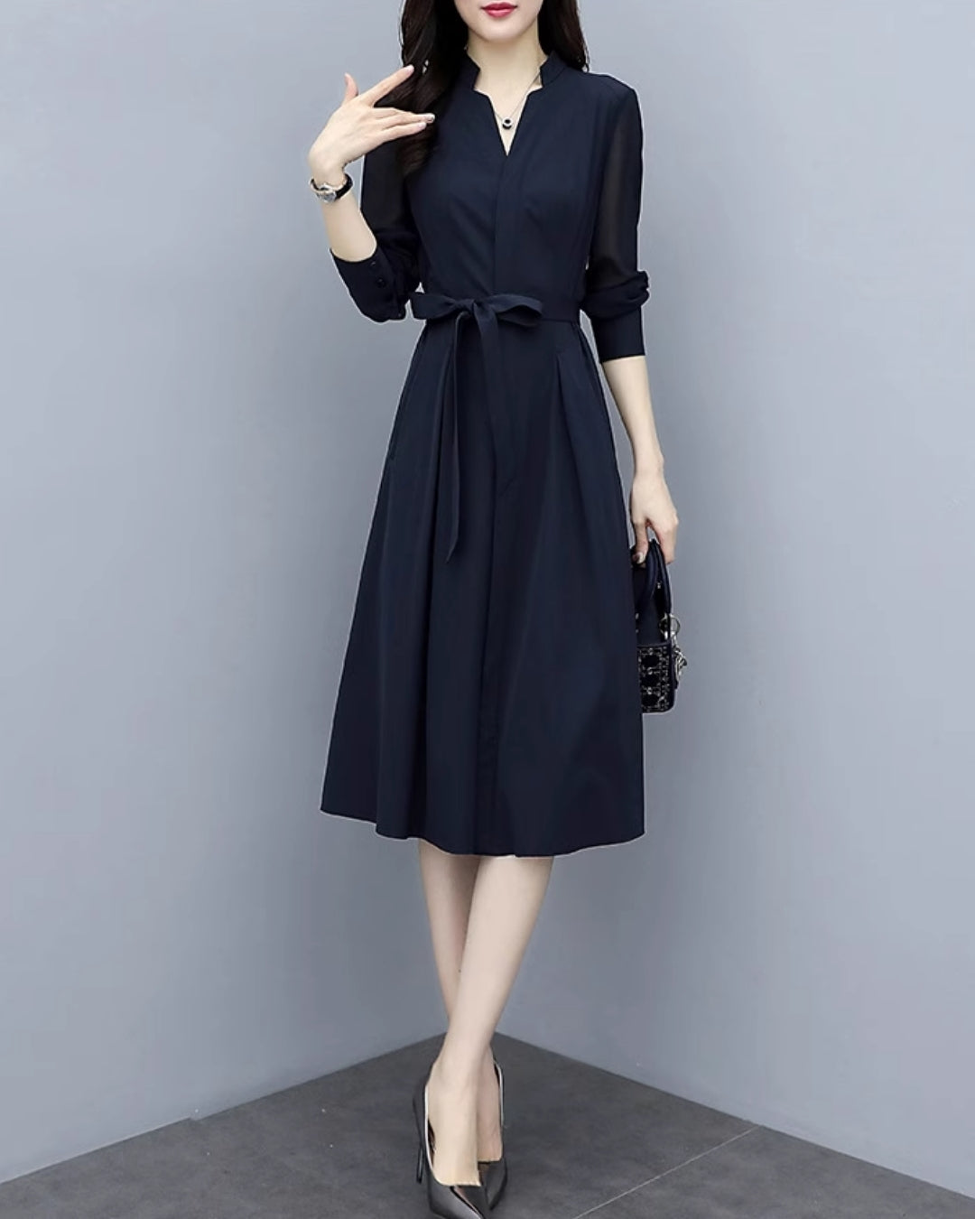 「ネイビーの発色がとても上品で、顔色がパッと明るく見えます。体のラインを拾わず、縦ラインをすっきり整えてくれるので“無理のない細見え”が叶いますよ✨ シワも気になりにくいから長時間のお出かけも安心。『キレイに見られたい日』の心強い味方になりますので、ぜひ押さえてくださいね!」