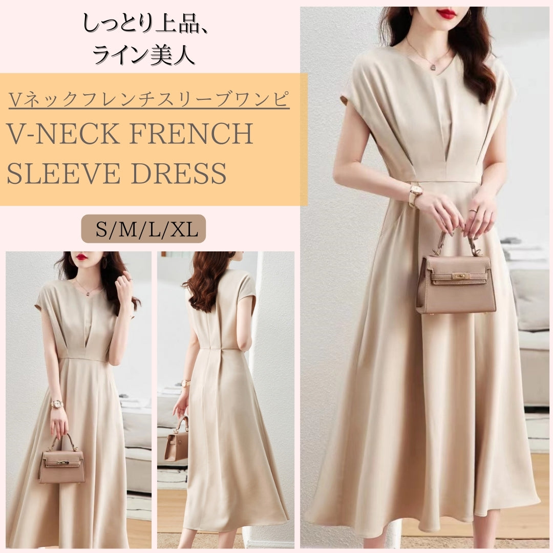 深すぎないVネックが首元をシャープに見せて、アクセなしでも洗練された印象に。甘すぎない大人の華やかさで、外に出る自分に自信が持てるワンピです。