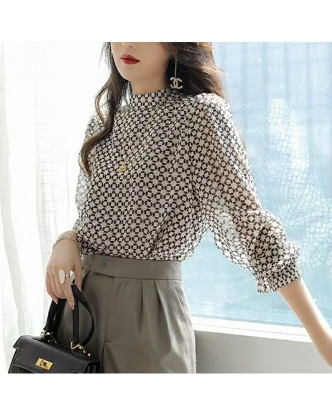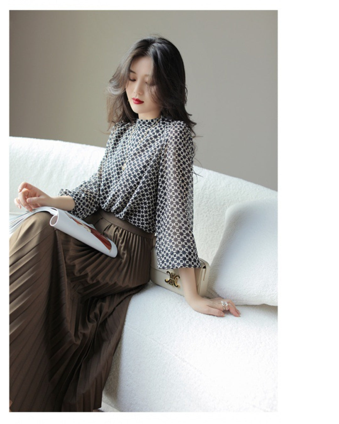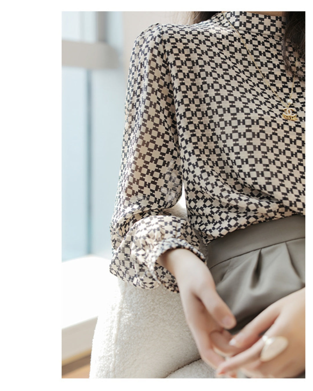 透け感素材×幾何柄で上品映え|スタンドカラーブラウス