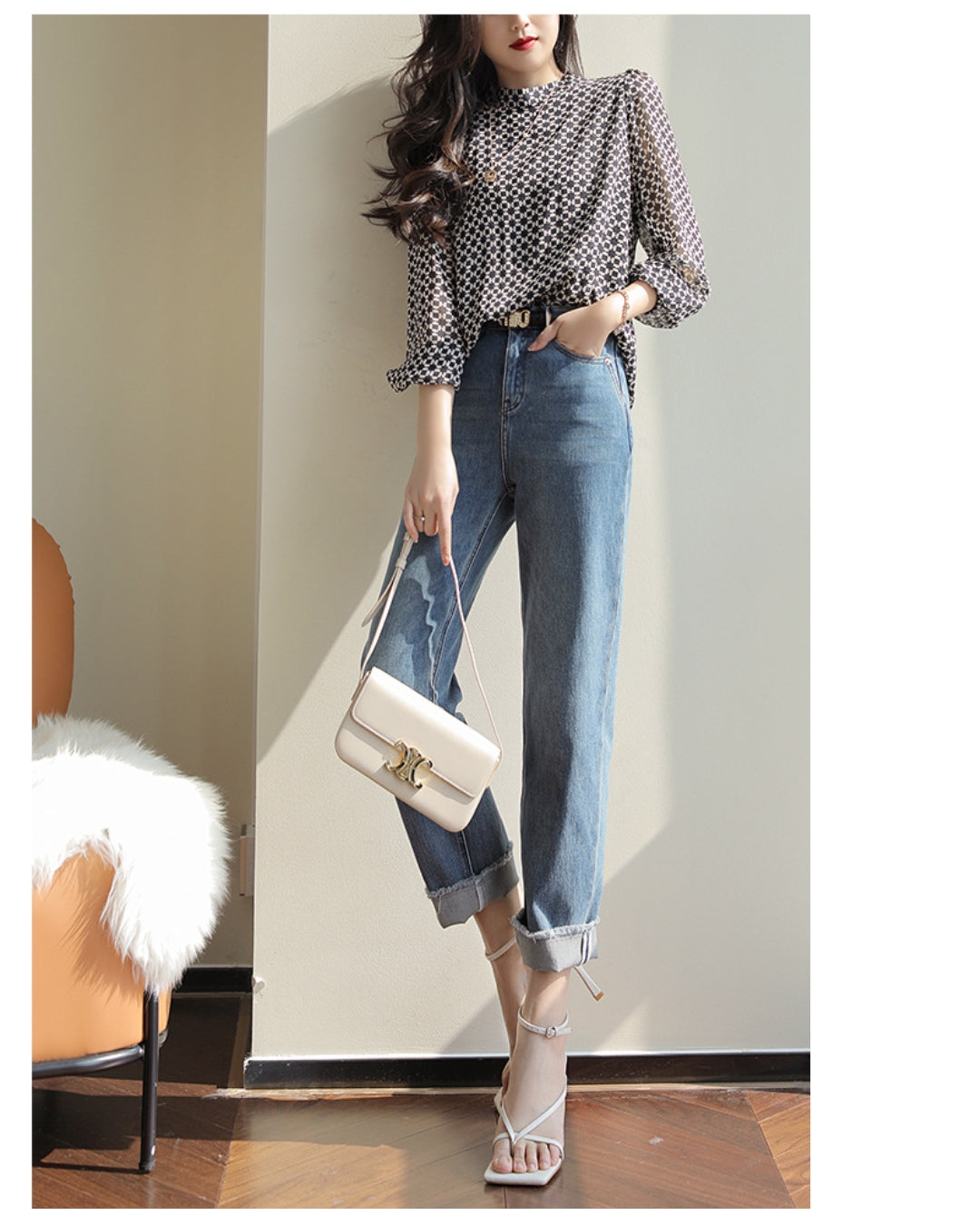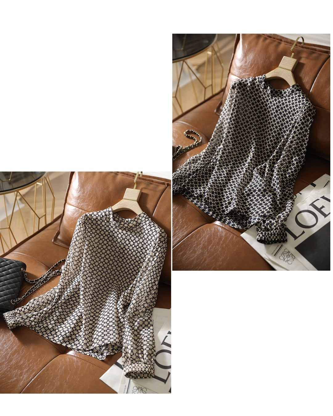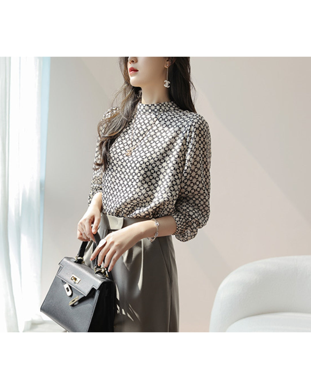 透け感素材×幾何柄で上品映え|スタンドカラーブラウス
