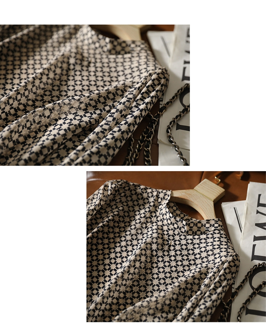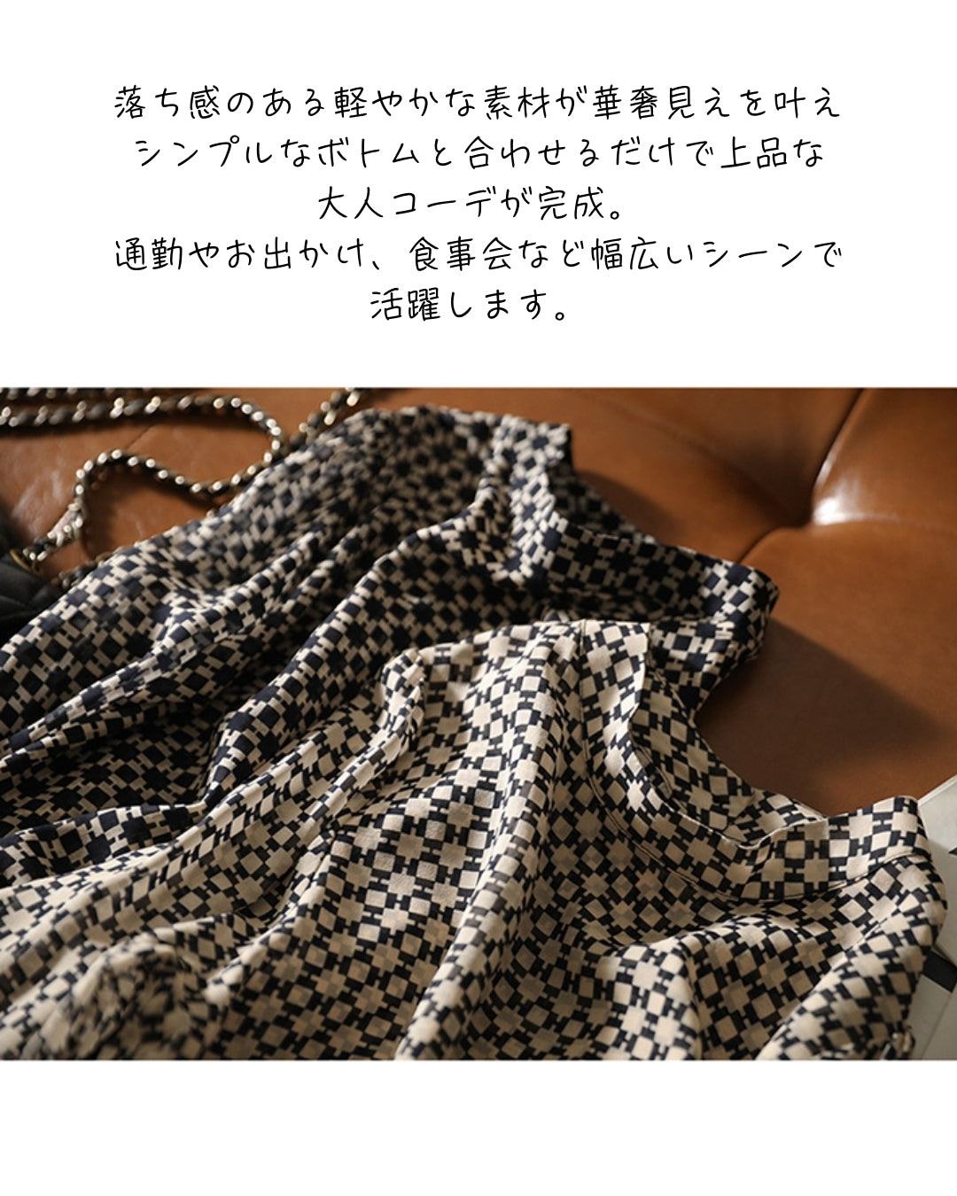 軽やかな透け感とレトロ柄が華奢見えと着映えを両立✨モノトーン配色で派手になりすぎず、大人の女性にぴったりな上品さを演出