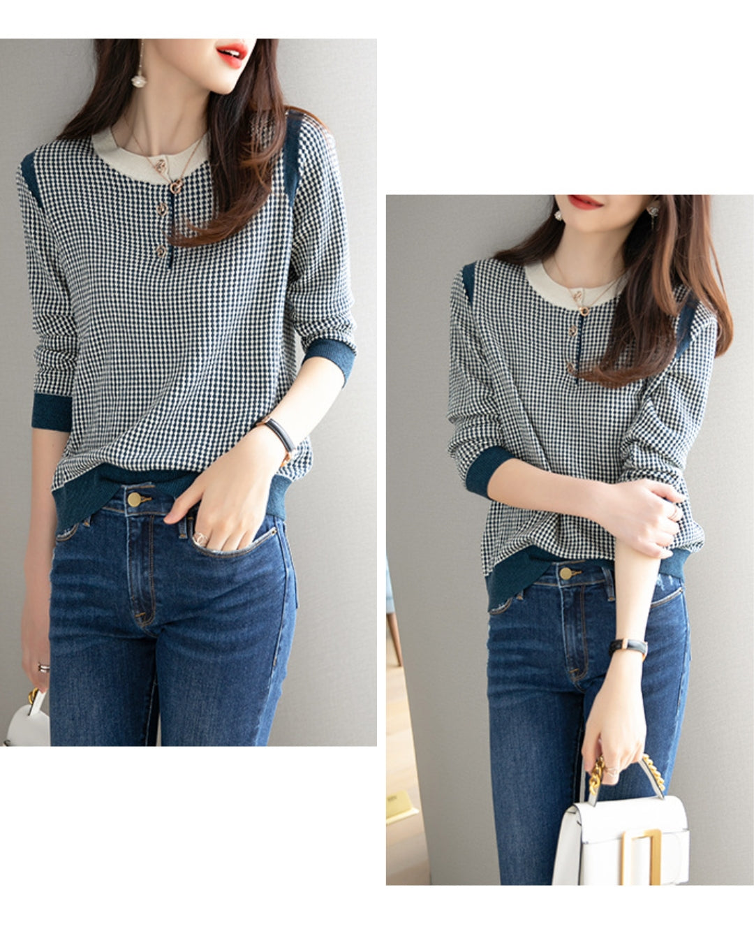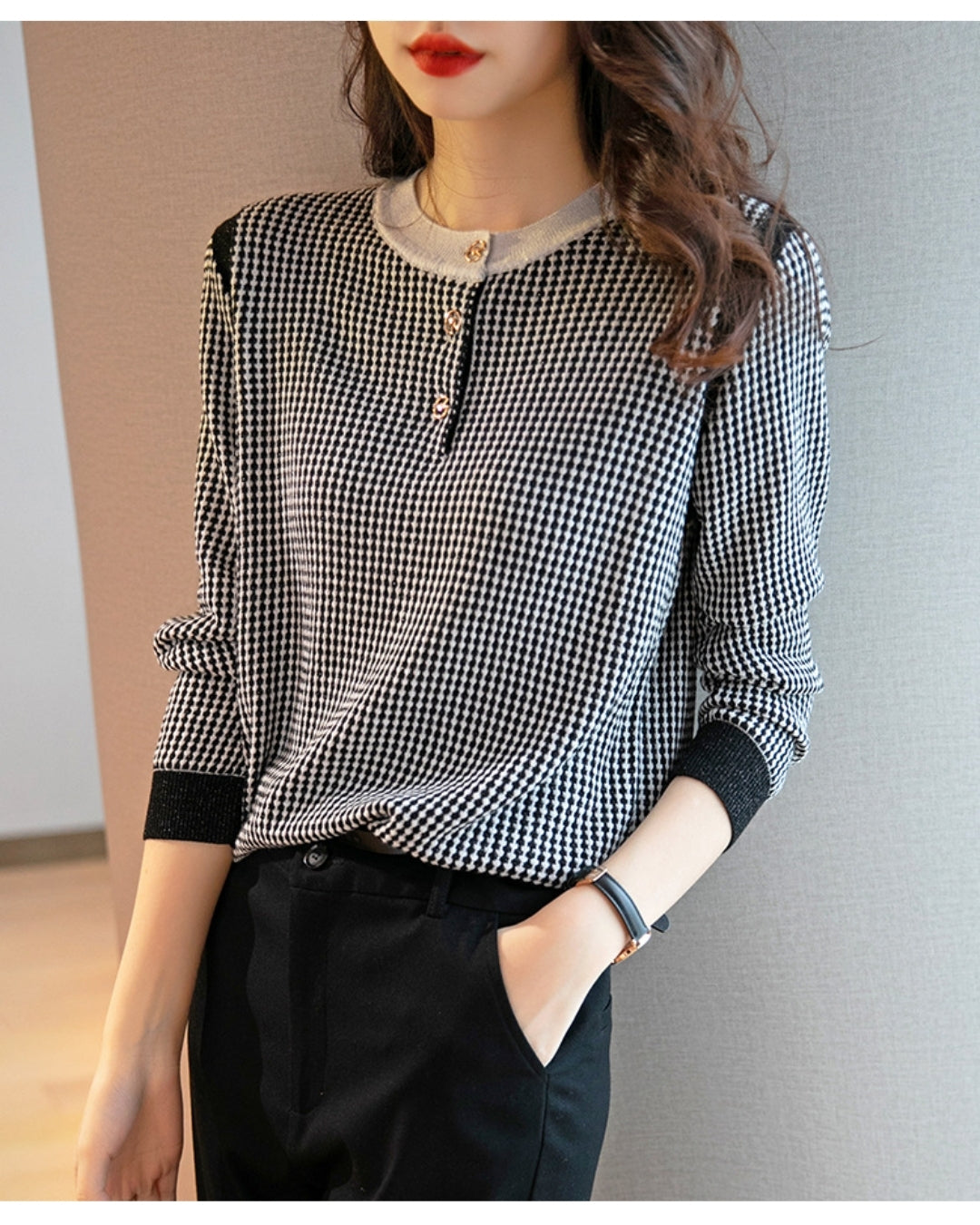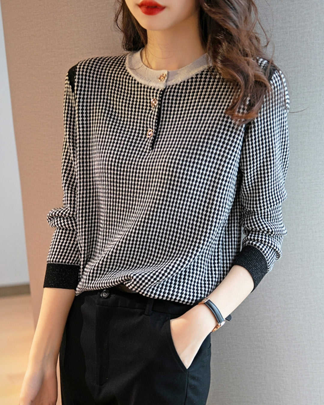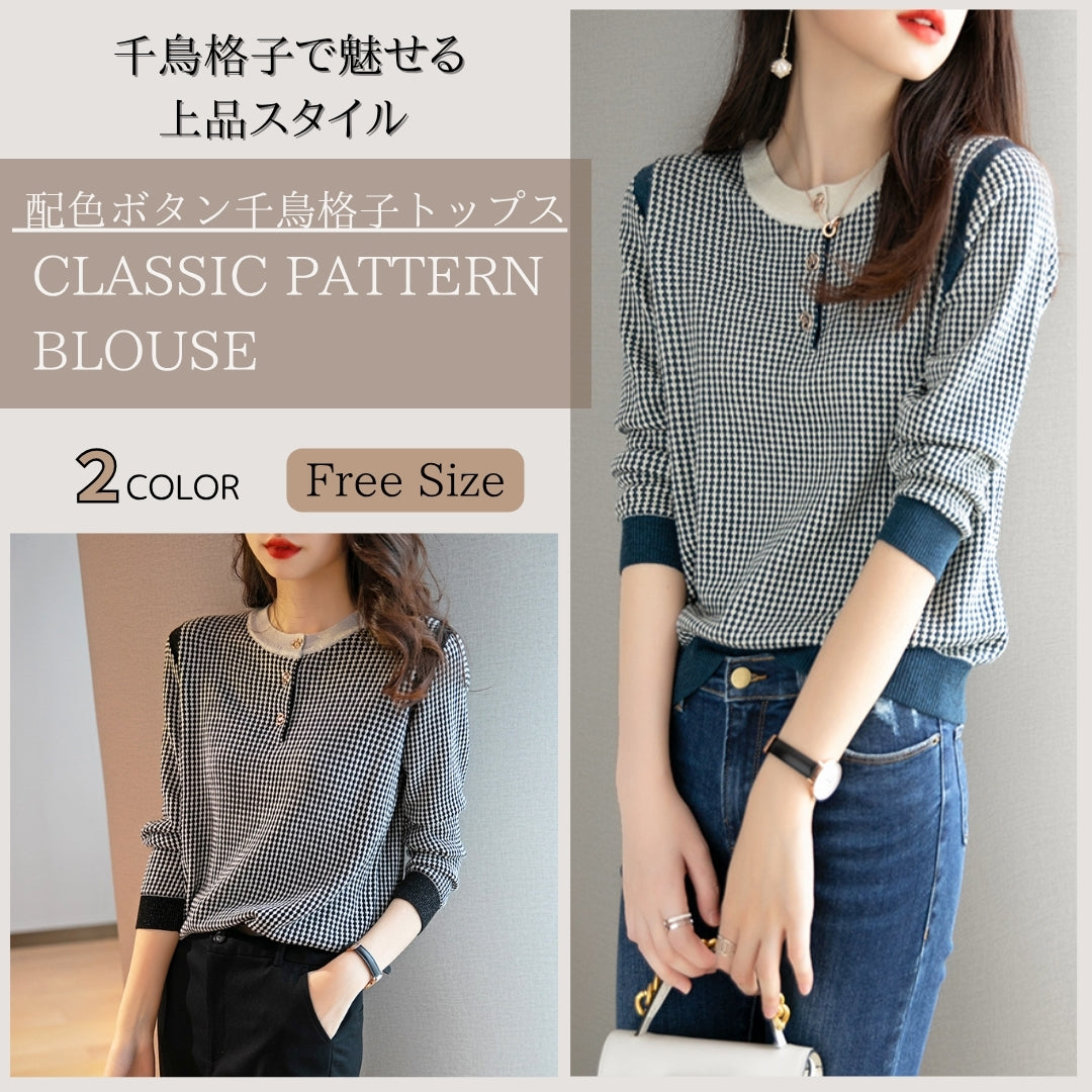 配色ボタンチェック柄トップス【千鳥格子で魅せる上品スタイル】
