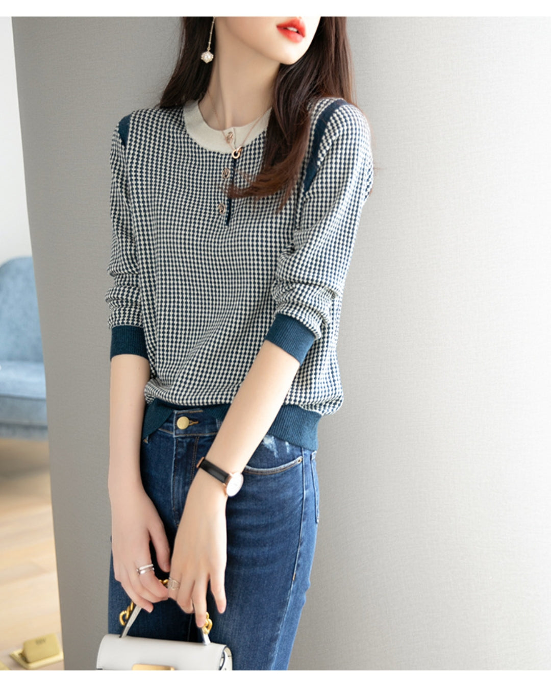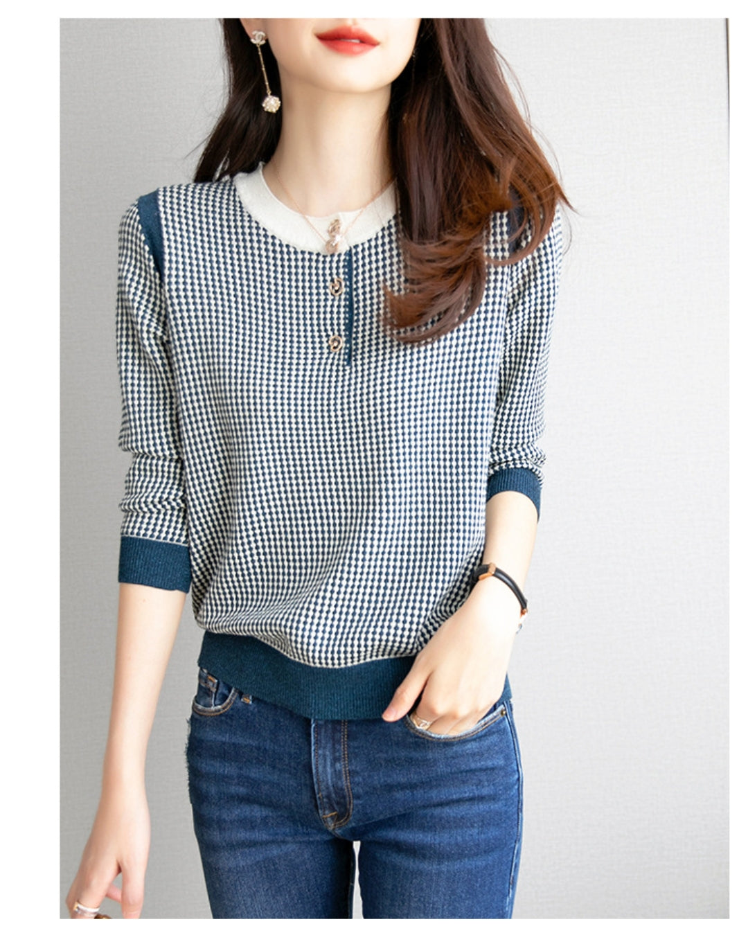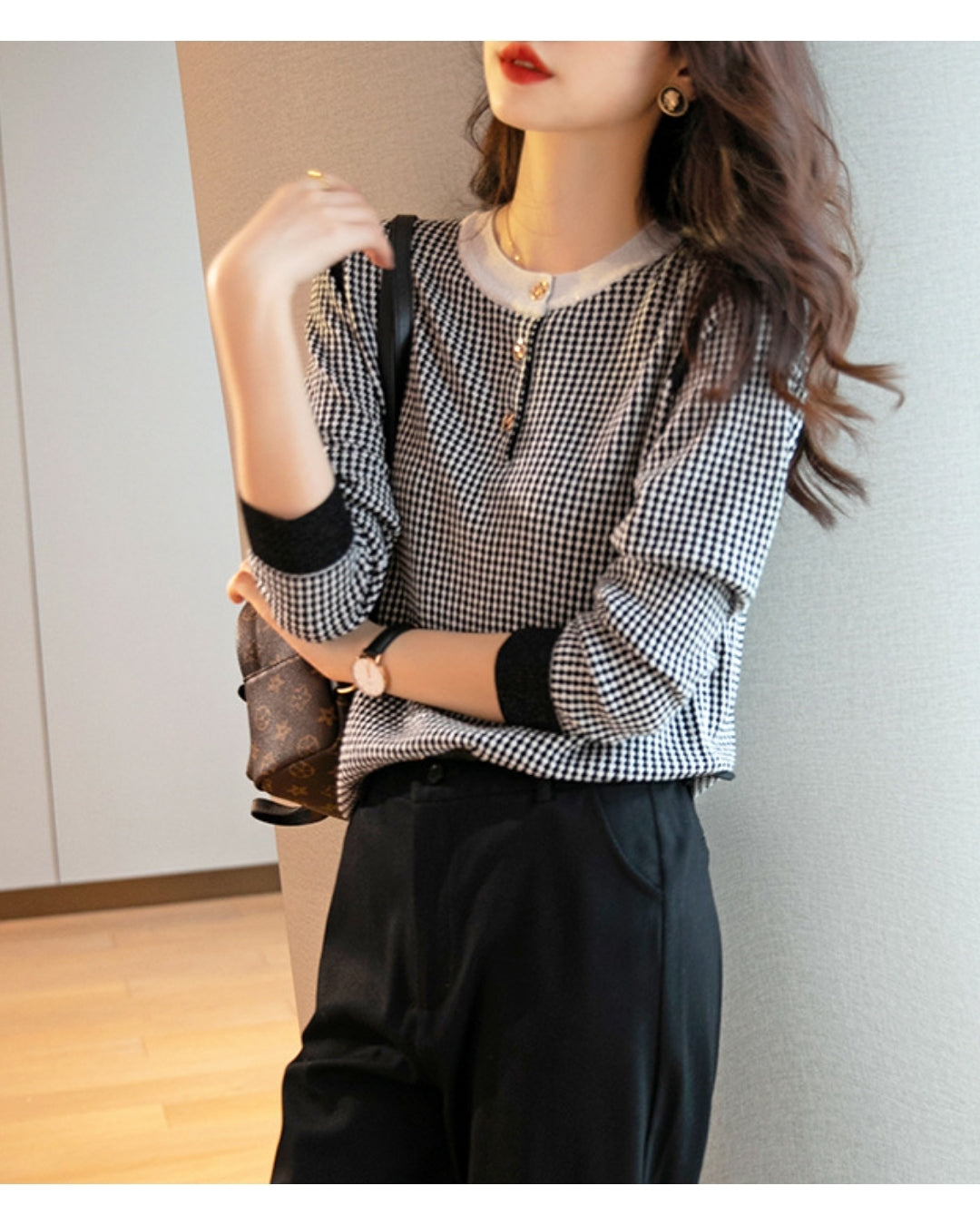 配色ボタンチェック柄トップス【千鳥格子で魅せる上品スタイル】