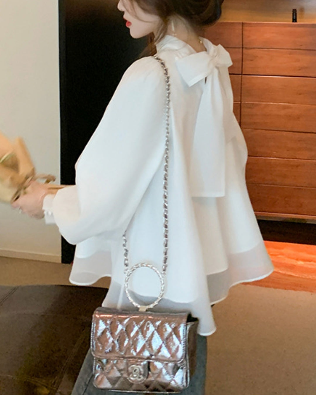 大きめのリボンがふんわりと揺れ、後ろ姿に華やかさをプラス。立ち襟×Aラインシルエットで、甘すぎず上品な印象に。オフィスでも休日でも女性らしさを引き立ててくれます。