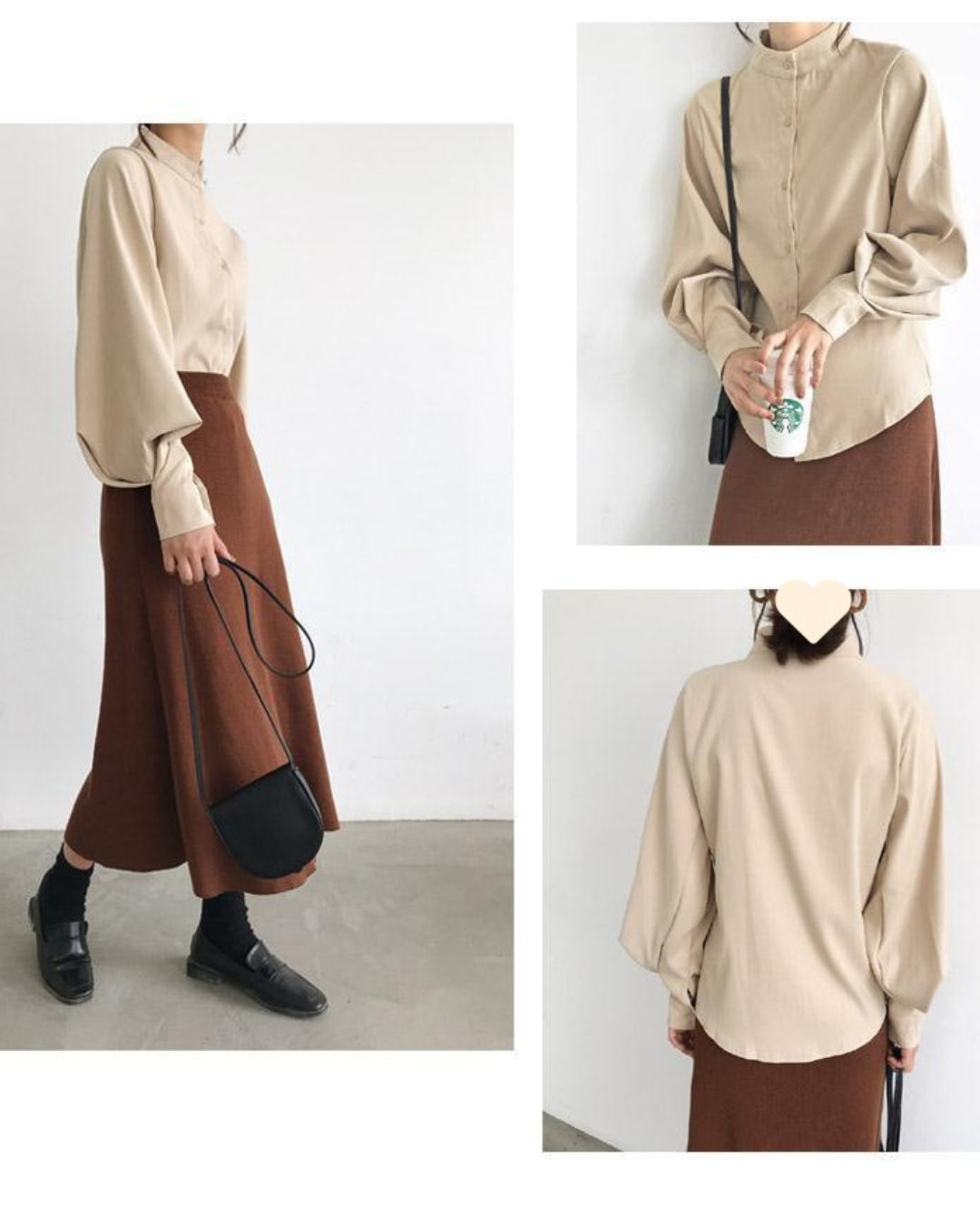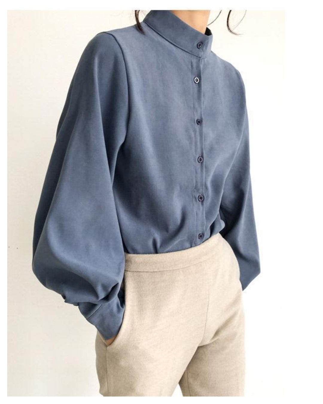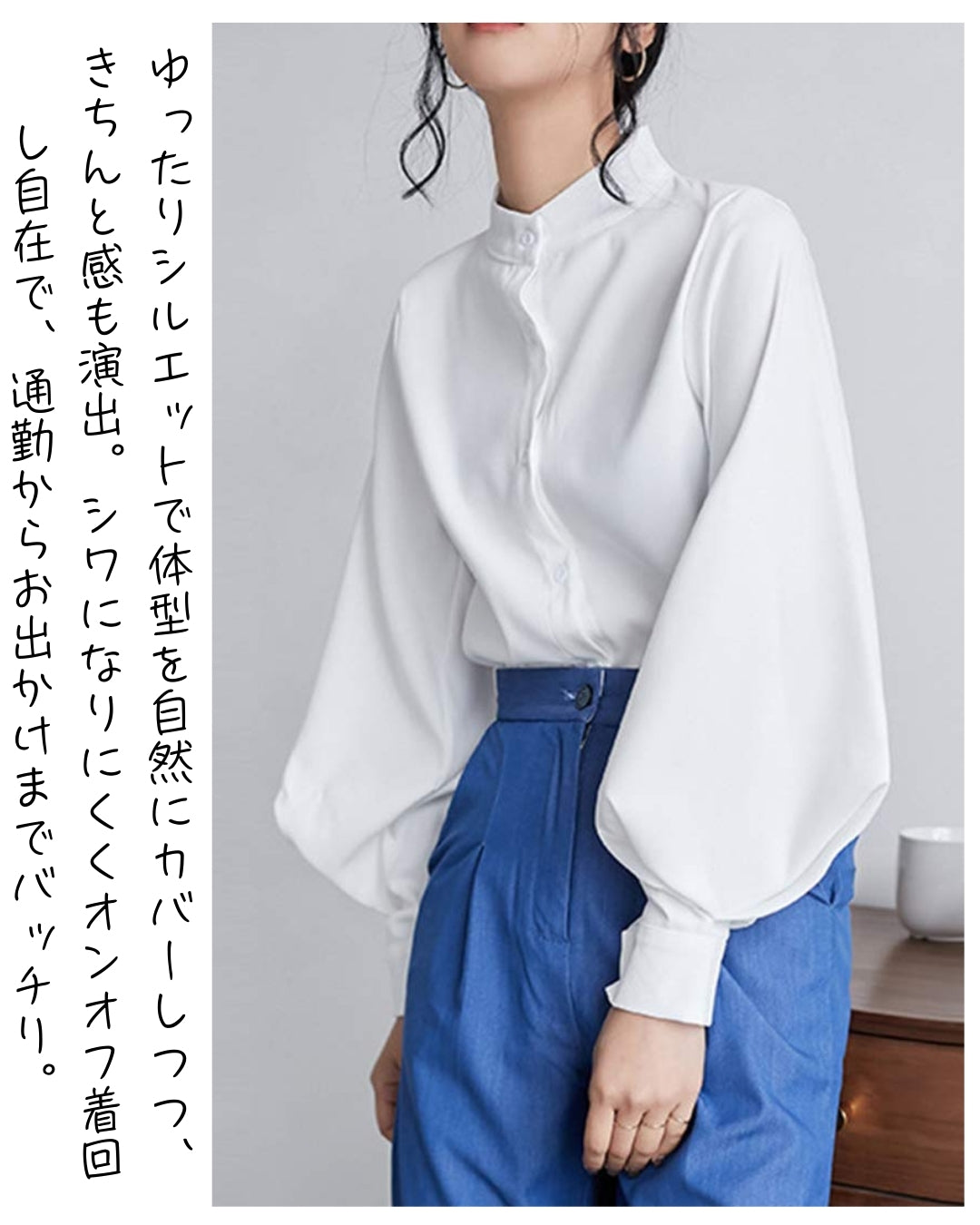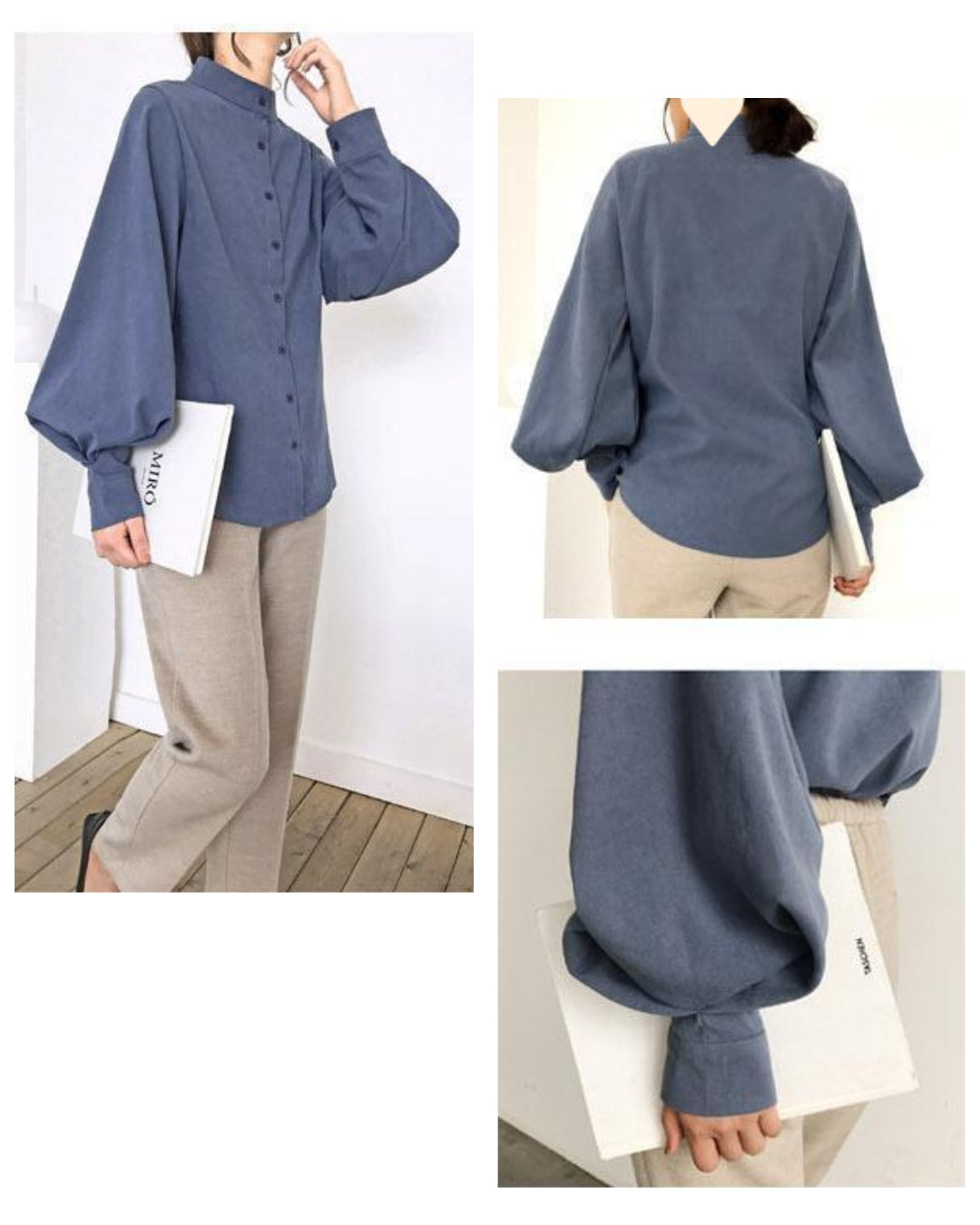 袖を通した瞬間、自然と背筋が伸びるような端正なシルエット。立ち襟とボリューム袖が顔まわりをすっきり見せ、シンプルなのに洗練された印象に仕上がります。「きちんと見えるかな?」という不安を感じさせない、大人のためのブラウスです。