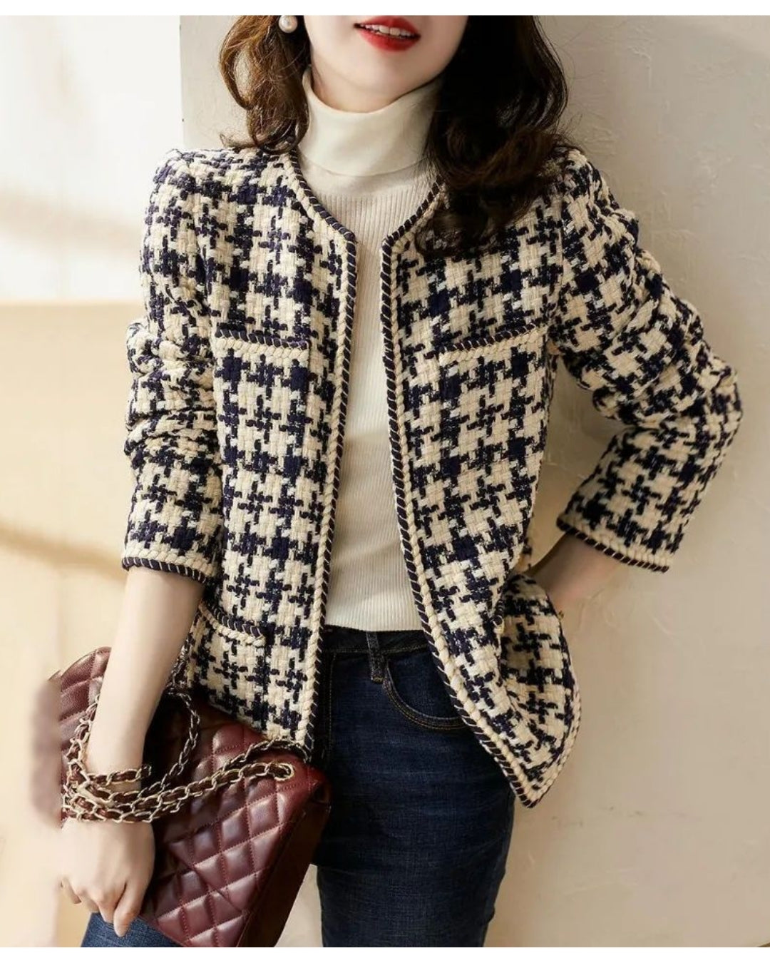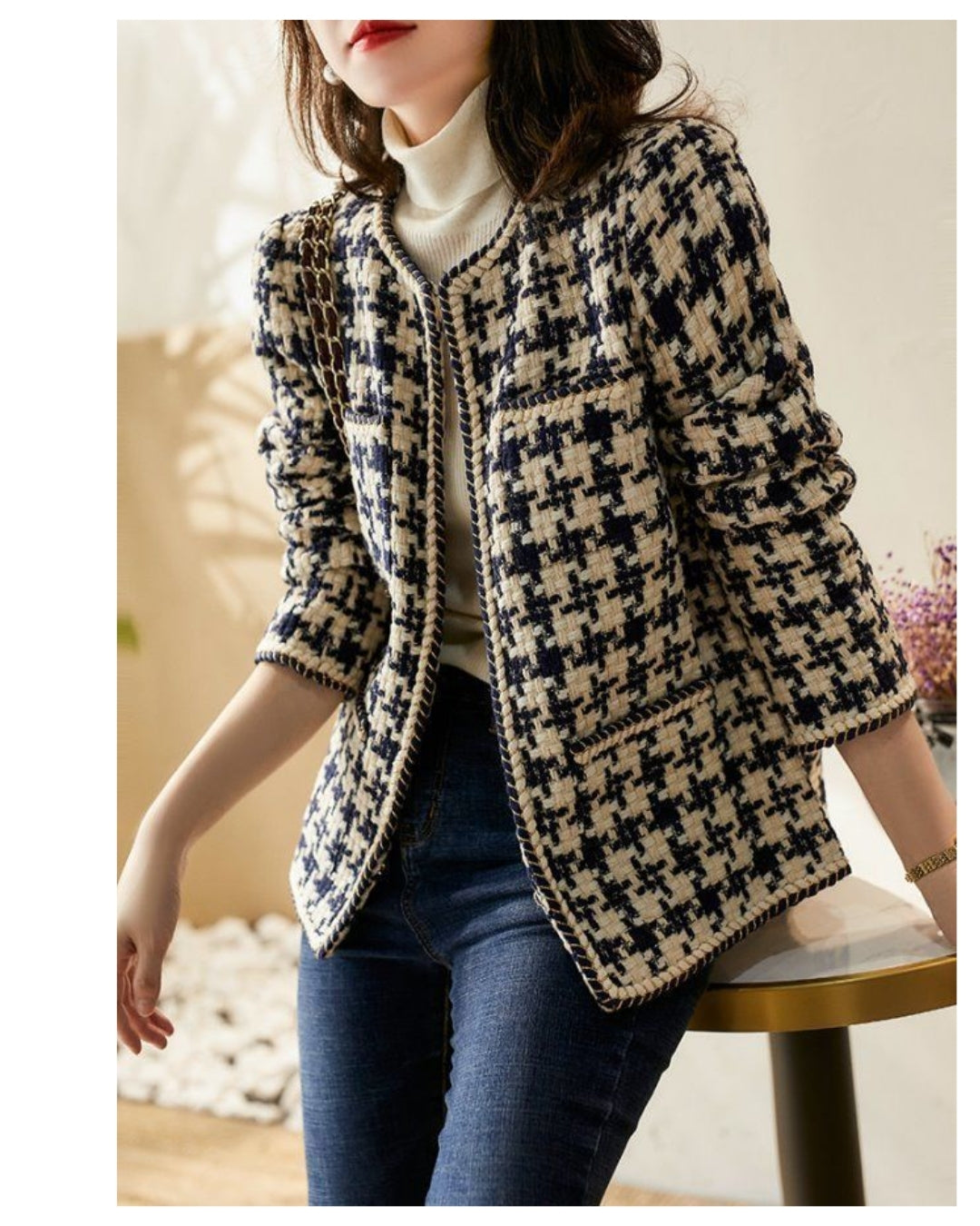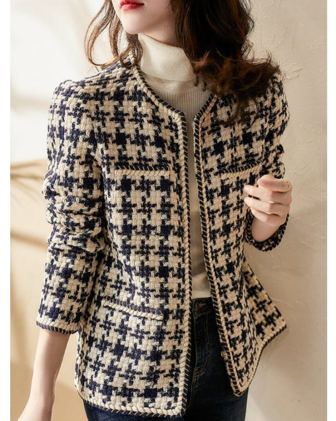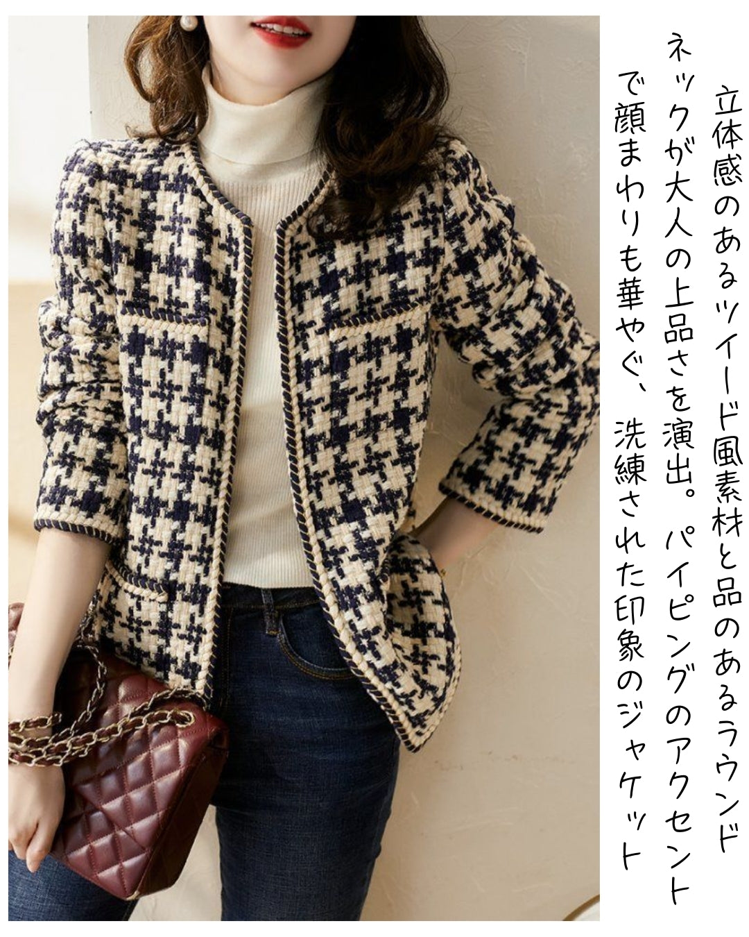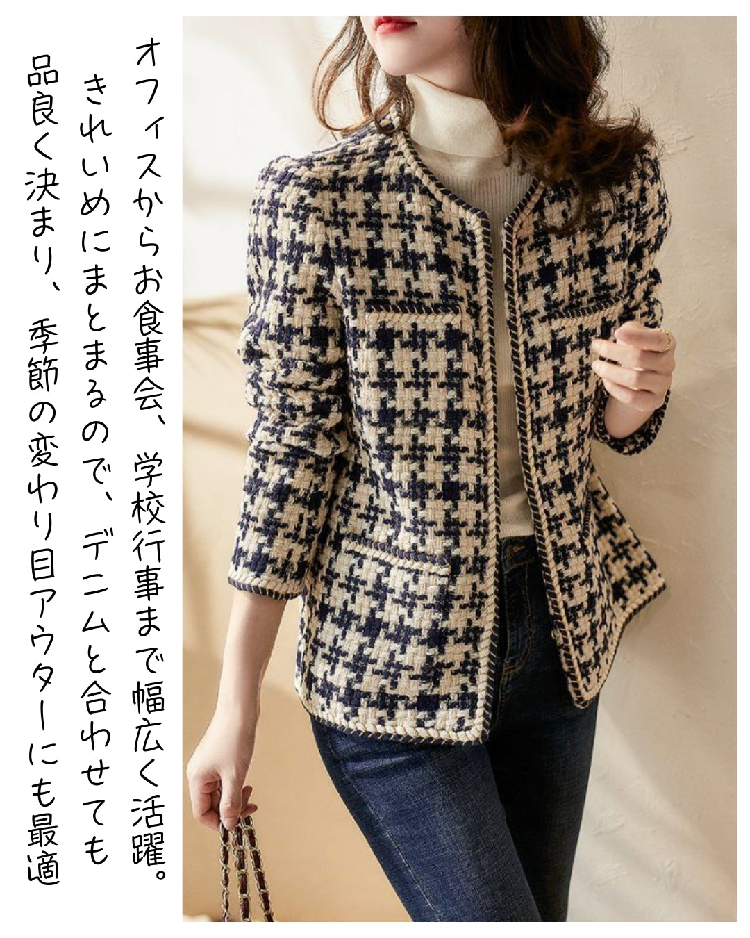 ツイード風でも重くない快適な着心地。春秋はもちろん、寒さが残る日もタートル重ねでしっかり暖か。厚すぎず薄すぎないバランスで、ロングシーズン活躍します。室内外の寒暖差がある日にも使いやすく、一枚あると本当に重宝するアイテムです。